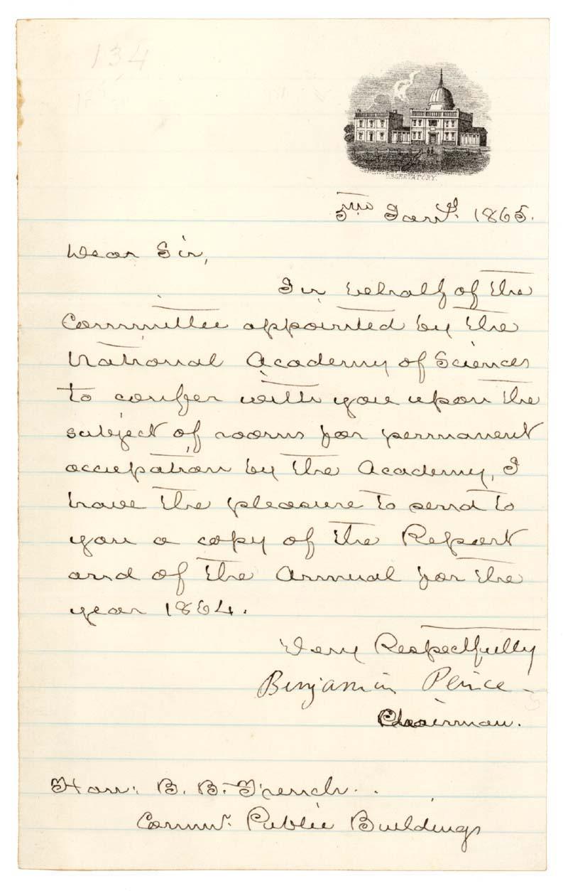 BENJAMIN PEIRCE (1809-1880) American mathematician who taught at Harvard University. Peirce made contributions to celestial mechanics, number theory and algebra. Autograph Letter Signed, ""Benjmain Peirce,"" bearing an engraving of an observatory. One page, 5"" x 8"". No place. January 5, 1865. Peirce writes to ""Hon. B.B. French"": On behalf of the Committee appointed by the Natinoal Academy of Sciences to confer with you upon the subject of rooms for permanent occupation by the Academy, I have the pleasure to send to you a copy of the Report and of the Annual for the year 1864 ... "" Mounting trace on verso. Overall Fine.