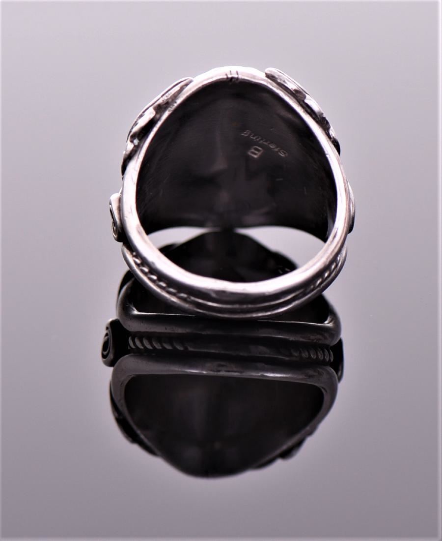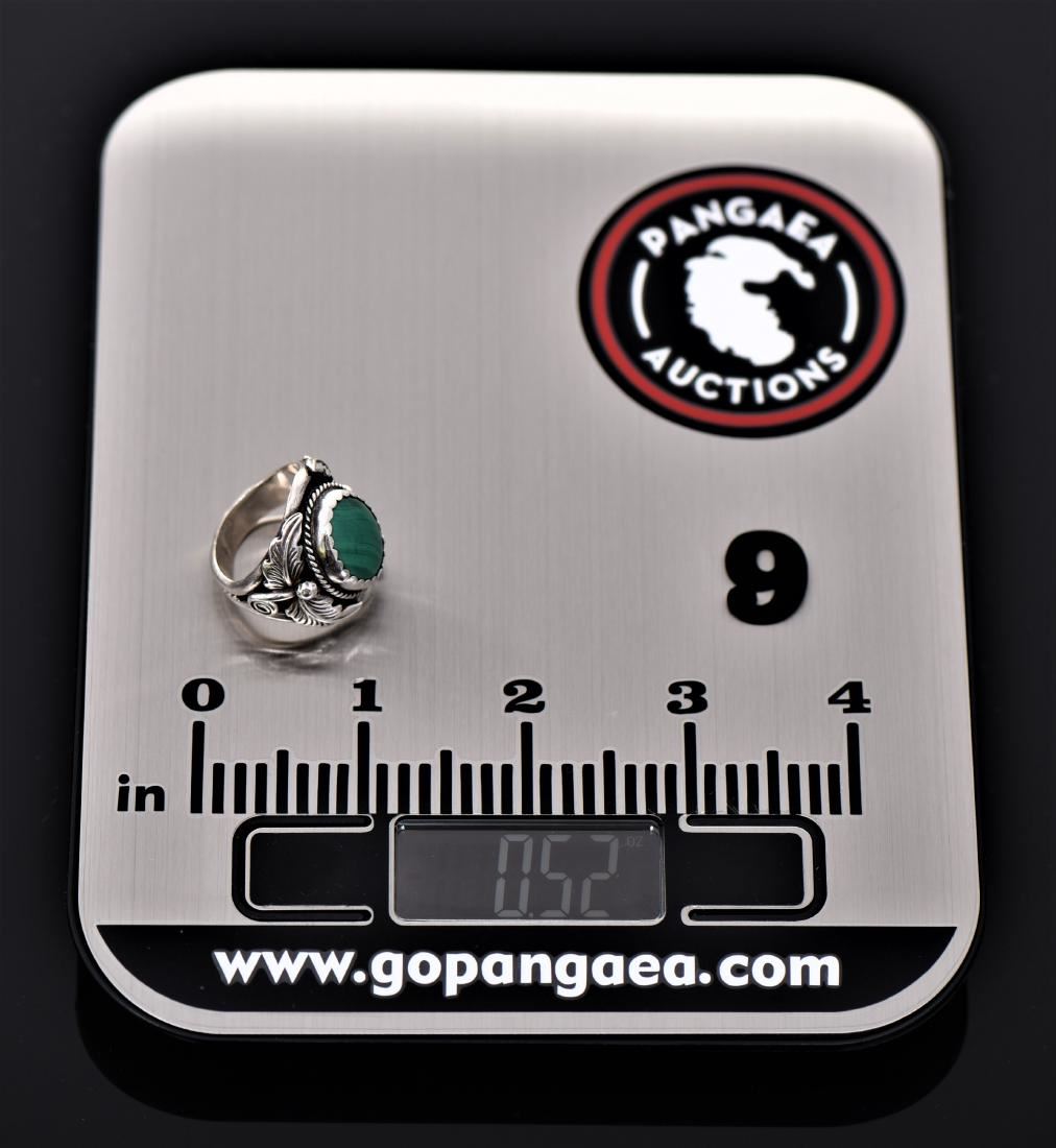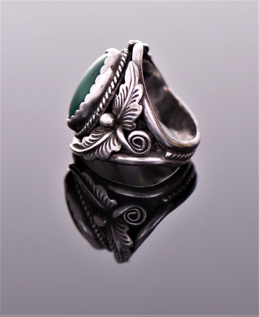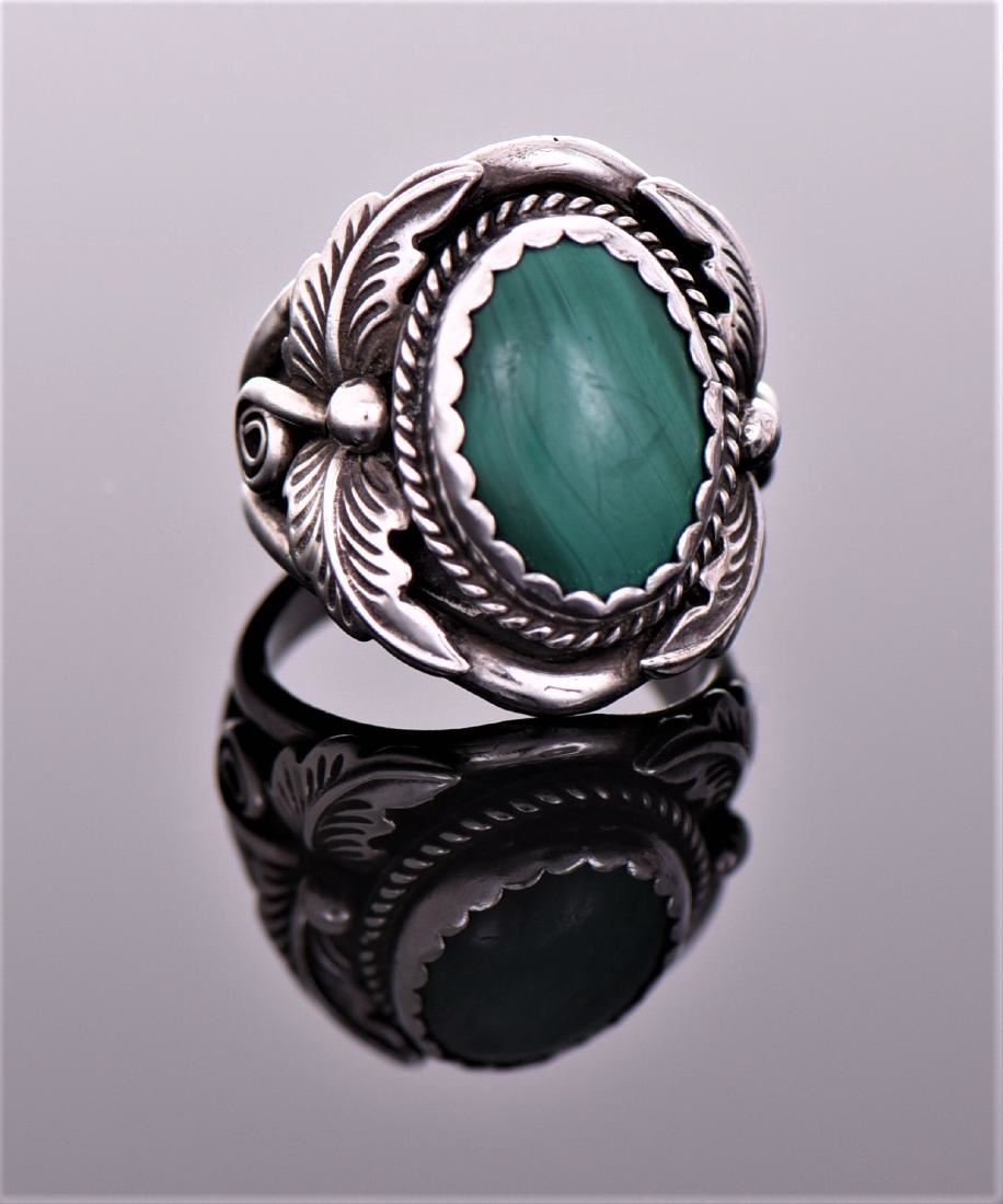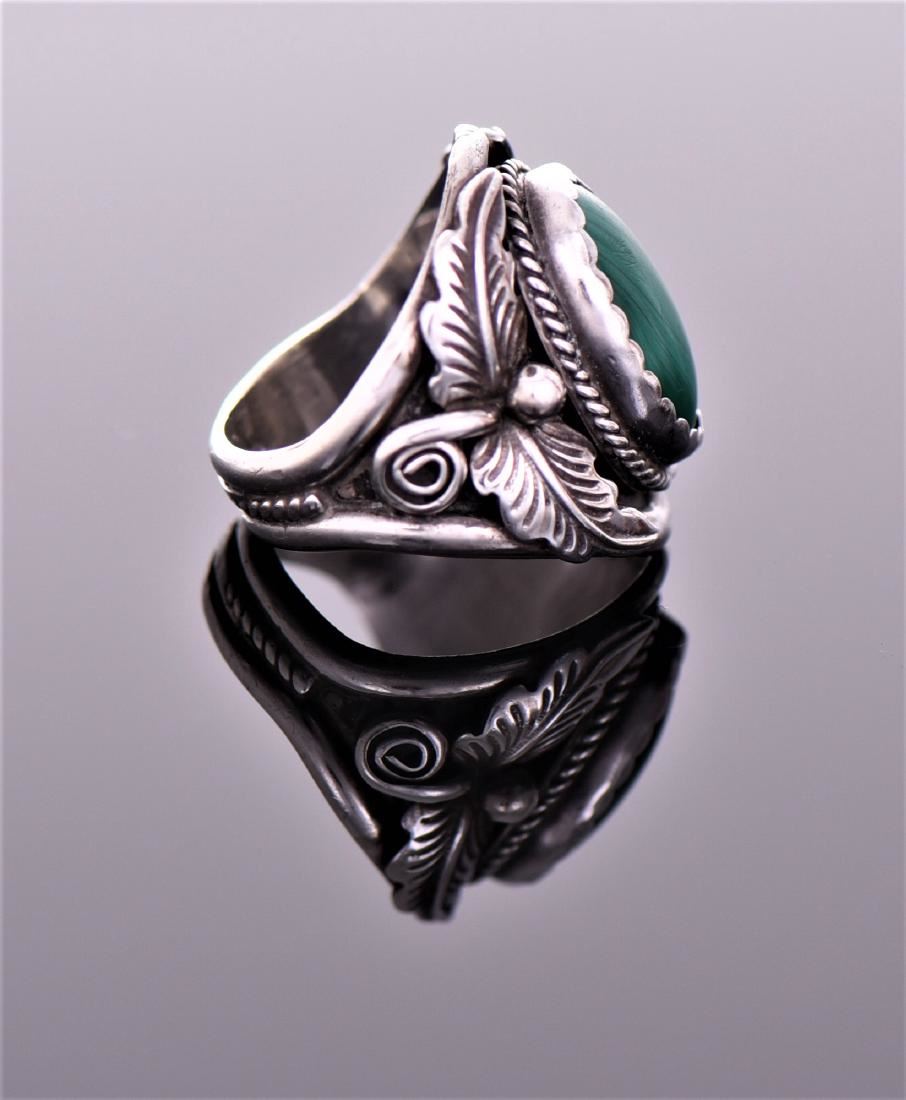 Benjamin Piaso, Navajo Malachite Sterling Silver Ring With Beautiful Silversmithing. Silver Tested. Ring Size 9. Estimated less than 50 yrs old. The Navajos are a Native American people of the Southwestern United States. After the Cherokee, they are the second largest federally recognized tribe in the United States. Until contact with Pueblos and the Spanish, the Navajos were largely hunters and gatherers. The tribe adopted crop farming techniques from the Pueblo peoples. The practice of spinning and weaving wool into blankets and clothing became common and eventually developed into a form of highly valued artistic expression. Silversmithing is an important art form among Navajos. Atsidi Sani c. 1830–c. 1918 is considered to be the first Navajo silversmith. He learned silversmithing from a Mexican man called Nakai Tsosi "Thin Mexican" around 1878 and began teaching other Navajos how to work with silver. By 1880, Navajo silversmiths were creating handmade jewelry including bracelets, tobacco flasks, necklaces and bracers. Later, they added silver earrings, buckles, bolos, hair ornaments, pins and squash blossom necklaces for tribal use, and to sell to tourists as a way to supplement their income. The Navajos' hallmark jewelry piece called the "squash blossom" necklace first appeared in the 1880s. Turquoise has been part of jewelry for centuries, but Navajo artists did not use inlay techniques to insert turquoise into silver designs until the late 19th century. (Wikipedia) Size and/or Weight: See Measurement Photo. (Photos Represent The Lot Condition.)