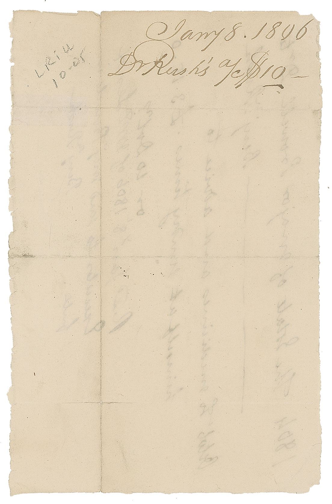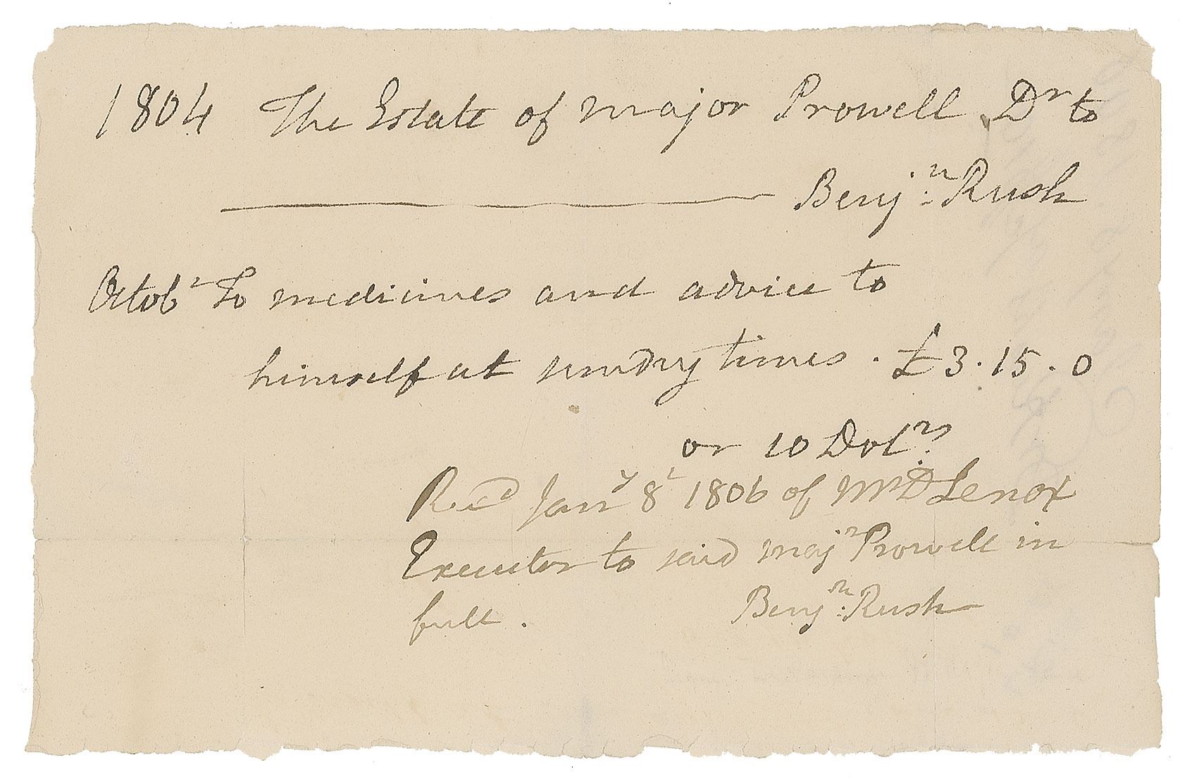 Twice-signed ADS, signed “Benj'n Rush,” one page, 6.5 x 4.25, January 8, 1806. An October 1804 payment receipt from "The Estate of Major Prowell," paid to Dr. Benjamin Rush for "medicines and advice to himself at sundry times," amounting to a total of £3.15.0 or $10, with Rush adding below: "Rec'd Jan'y 8 1806 of Mr. D. Lenox Executor to said Maj'r Prowell in full." Signed neatly at the top and at the conclusion by Rush. In fine condition, with two small fold splits.