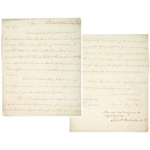 <Our item number 140886><B>Rush, Benjamin.</B> (1745-1813) Signer of the Declaration of Independence; American Physician and Educator.<BR>True copy of a letter written by Dr. Benjamin Rush to "the Right Honble Lord Buchan," 2pp (1 sheet, front and back), 9 x 7¼ in., Philadelphia, 4 July 4, 1809. Being a formal letter of introduction which evokes the names of General George Washington and President James Madison. In part:<BR><BR>"…my third son Dr. James Rush and a favorite Pupil Dr. Thomas Fuller (the son of a wealthy and respectable planter in South Carolina) who visit Edinburgh in order to prosecute their studies in medicine… They will inform your Lordship how much joy the renewal of the intercourse of our Country with great Britain diffused through all Classes of our citizens and the prosperity and happiness the united states now enjoy in the Administration of our government by Mr. Madison who with his own native talents aided by the singular prudence and common se nse of his predecessor General Washington has nearly driven party spirit from the Councils and people of our country…" Notated at the end, "A true copy from the original in my possession - Robert Anderson M.D." This true copy is written on fine period laid paper with an "1813" watermark. Excellent content. <BR>Estimated Value $1,000 - 2,000. <BR><BR>Our item number 140886<BR><IMAGES><P ALIGN="CENTER"><IMG SRC="http://www.goldbergcoins.net/liveauction/49jpegs/140886.jpg"> </P></IMAGES>