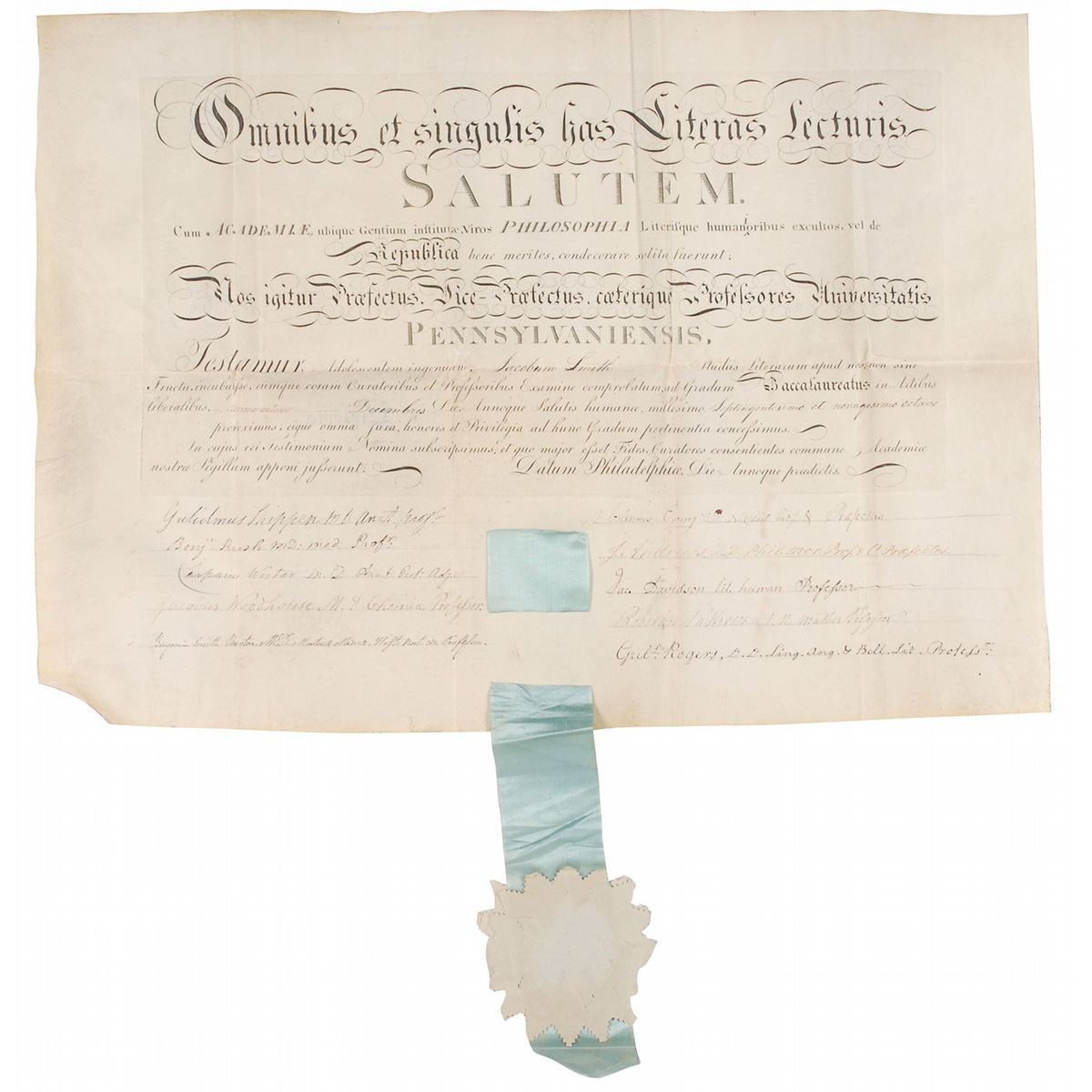 Physician and surgeon general of the Continental Army who signed the Declaration of Independence (1746–1813). Partly-printed vellum DS in Latin, signed “Benj’n Rush MD: Med: Prof’r,” one page, 21 x 15, December 18, 1798. A diploma from the University of Pennsylvania conferring upon “Jacobus Smith” a bachelor’s degree in liberal arts, the “Baccalaureatus in Artibus liberalibus.” Signed at the conclusion by Rush and nine other professors. The document retains its original blue ribbon and affixed white paper seals, with chipping to a few of the points. Heavy intersecting storage folds (one vertical fold passing through a single letter of the signature), scattered soiling and light creases, and a clipped lower left corner, otherwise fine condition.