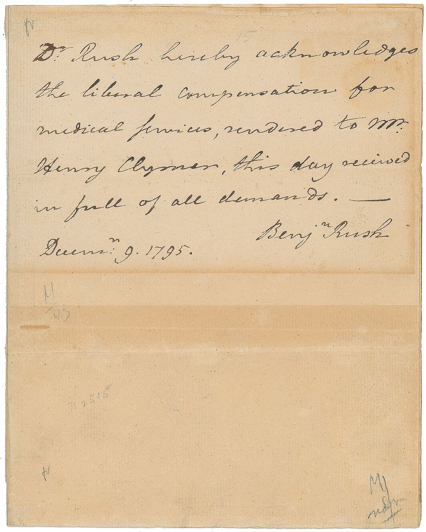 Physician and surgeon general of the Continental Army, signer of the Declaration of Independence, and early professor of medicine at the University of Pennsylvania (1746–1813). ALS signed “Benj’n Rush,” one page, 6.25 x 8, December 9, 1795. Letter to Henry Clymer, in full: “Dr. Rush hereby acknowledges the liberal compensation for medical services, rendered to Mr: Henry Clymer, this day received in full of all demands.” In very good to fine condition, with irregular toning and a repair to address leaf. A boldly penned example signed both within the text and at the conclusion.