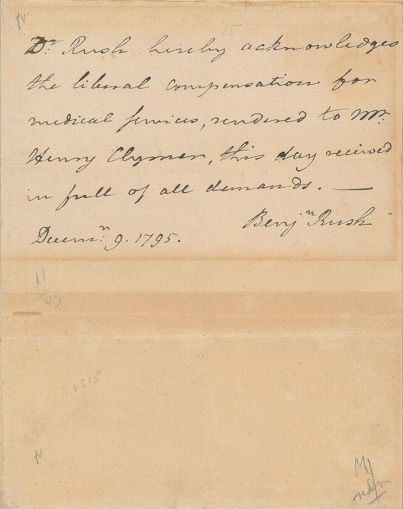 Physician and surgeon general of the Continental Army, signer of the Declaration of Independence, and early professor of medicine at the University of Pennsylvania (1746–1813). Sought-after ADS, signed “Benj'n Rush,” one page, 6.25 x 8, December 9, 1795. Receipt of payment addressed to Henry Clymer, in full: "Dr. Rush hereby acknowledges the liberal compensation for medical services, rendered to Mr. Henry Clymer, this day received in full of all demands." In very good to fine condition, with toning from prior display.