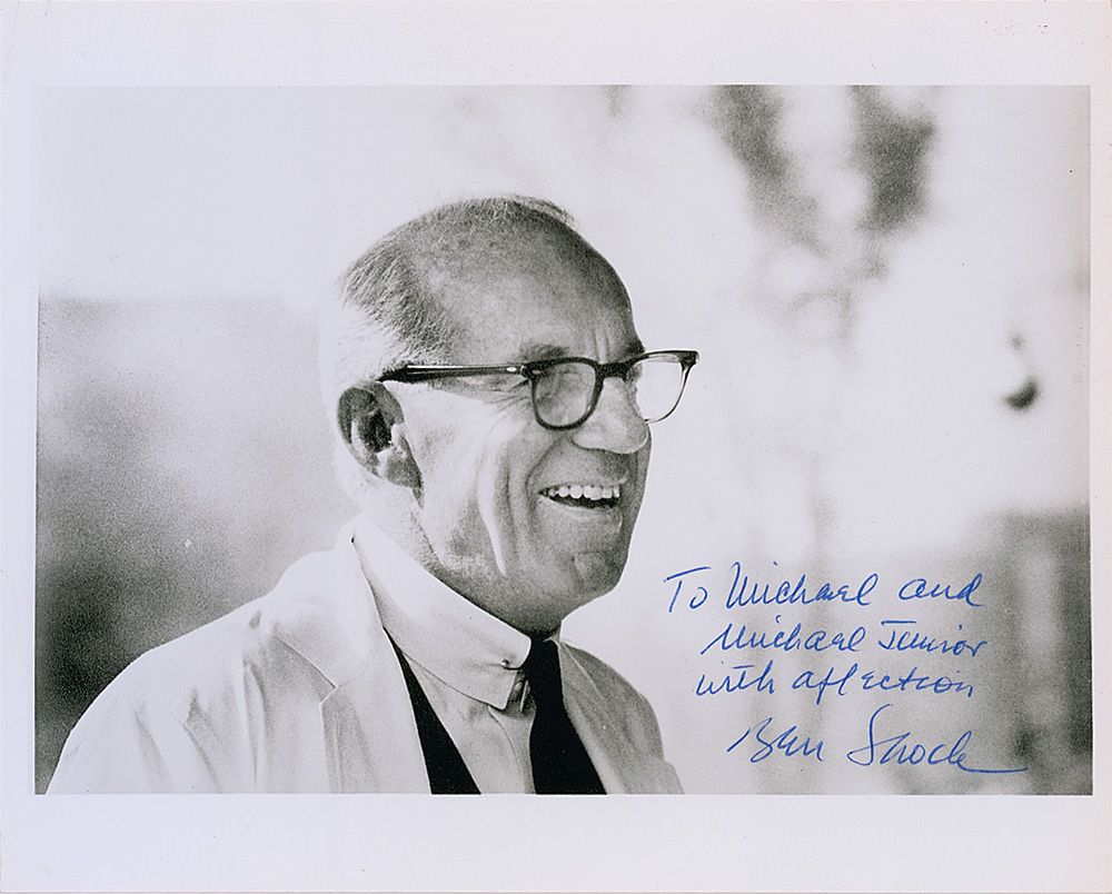 Matte-finish 10 x 8 photo of Spock in his lab coat, signed and inscribed in blue ballpoint “To Michael and Michael Junior, with affection, Ben Spock.” In fine condition, with a mild crease to the upper left corner.