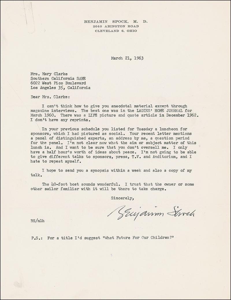 Baby doctor and best selling author (1903-1998) whose book Baby and Child Care, published in 1946, is one of the biggest best-sellers of all time. TLS, one page, 8.5 x 11, personal letterhead, March 21, 1963. Letter to a member of the group Southern California SANE organization regarding an upcoming luncheon. In part: “In your previous schedule you listed for Tuesday a luncheon for sponsors, which I had pictured as social. Your recent letter mentions a panel of distinguished experts, an address by me, a question period for the panel. I’m not clear now what the aim or subject matter of this lunch is. And I want to be sure that you don’t oversell me. I only have a half hour’s worth of ideas about peace. I’m not going to be able to give different talks to sponsors, press, T.V. and auditorium, and I hate to repeat myself.” In fine condition, with a paperclip impression to top edge and a few light wrinkles.