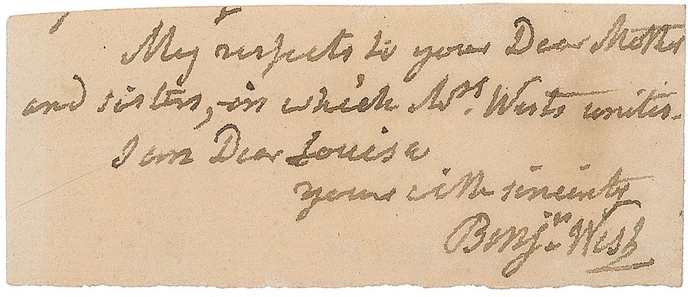 Distinguished Anglo-American artist (1738–1820) best known for his large-scale paintings of historical scenes. ANS signed “Benj’n West,” one page on a 3.75 x 1.5 clipped slip, no date. Brief note to “Louise.” In full: “My respects to your Dear Mother and sisters, in which Mrs. West unites.” In fine condition, with mild toning.