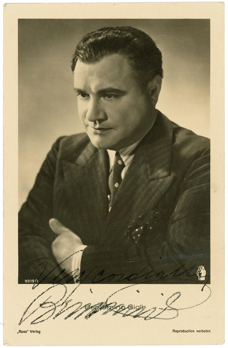 Vintage matte-finish 3.5 x 5.5 postcard photo, signed in fountain pen, “Very Cordially, Benjamino Gigli.” In fine condition, with scattered surface creases, faint scuffing, and trivial brushing to the signature. An intense pose of the most famous opera tenor of his generation. Pre-certified PSA/DNA and RRAuction COA.