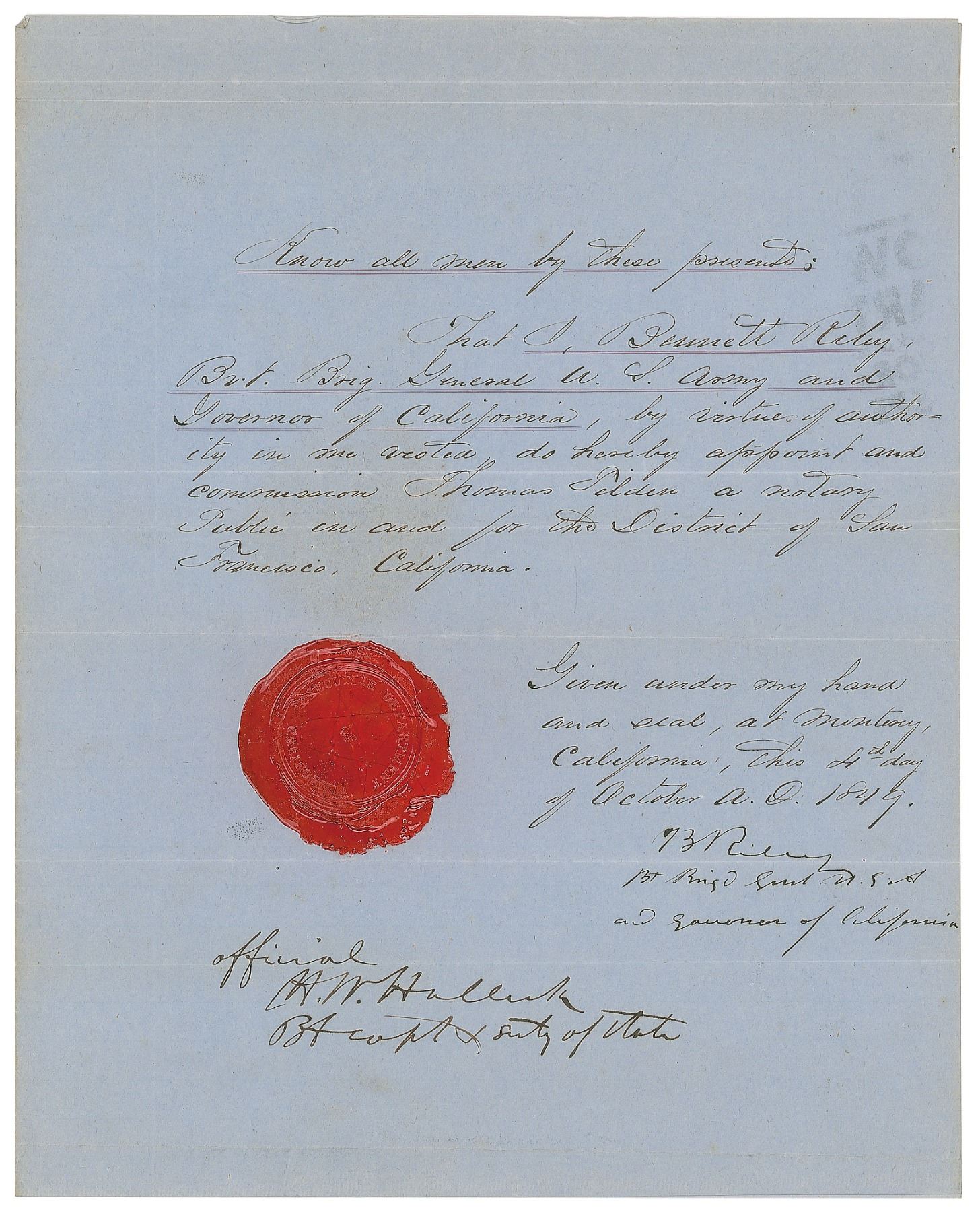 Manuscript DS, signed “B. Riley, Bt. Brigd. Gen'l U.S.A. and governor of California,” and "H. W. Halleck, Bt. Capt. & Secty of State," one page, 7.75 x 9.75, October 4, 1849. As governor of California, Riley appoints "Thomas Tilden a notary public in and for the District of San Francisco, California." Signed at the conclusion by Riley and countersigned by Halleck. The red wax seal affixed to the left side remains intact. In fine condition, with multiple horizontal folds. A desirable, early California document, pre-dating its admission into the Union—California sought statehood in 1849, and it was admitted to the Union as a free state on September 9, 1850.