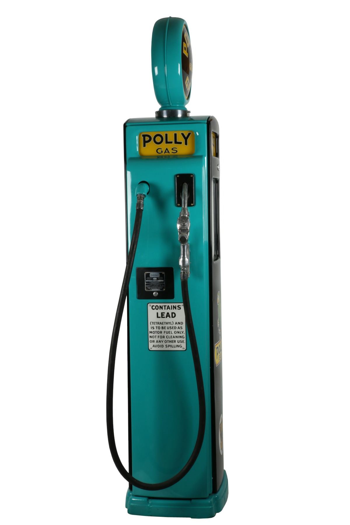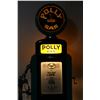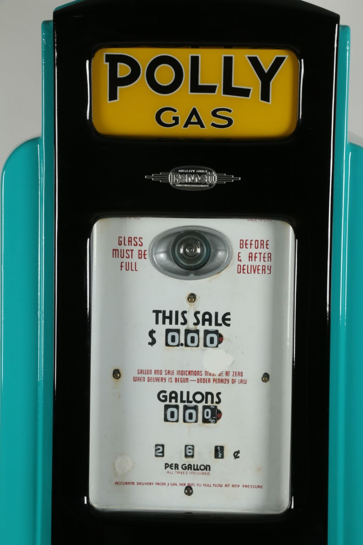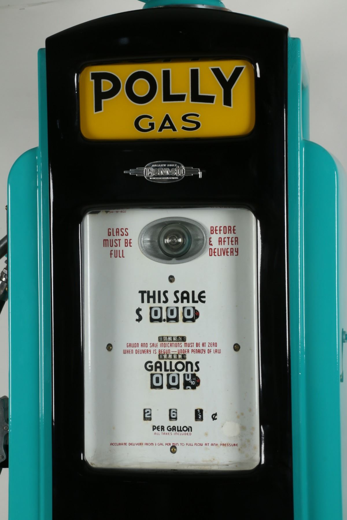 Circa 1940. Bennett Model "541". Restored to "Polly Gas", including matching decals, ad glass and reproduction globe. Lights properly. 72" x 20" x 16" +Globe. Porcelain register faces have a few touch-ups. Interior pumping mechanism removed. Shallow impressions and surface scuffs to the body. $2500-3500.