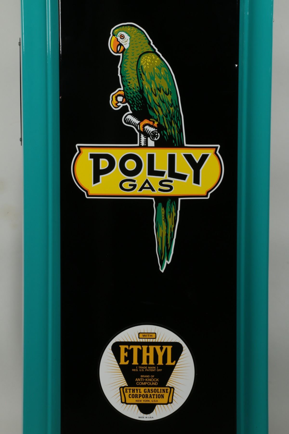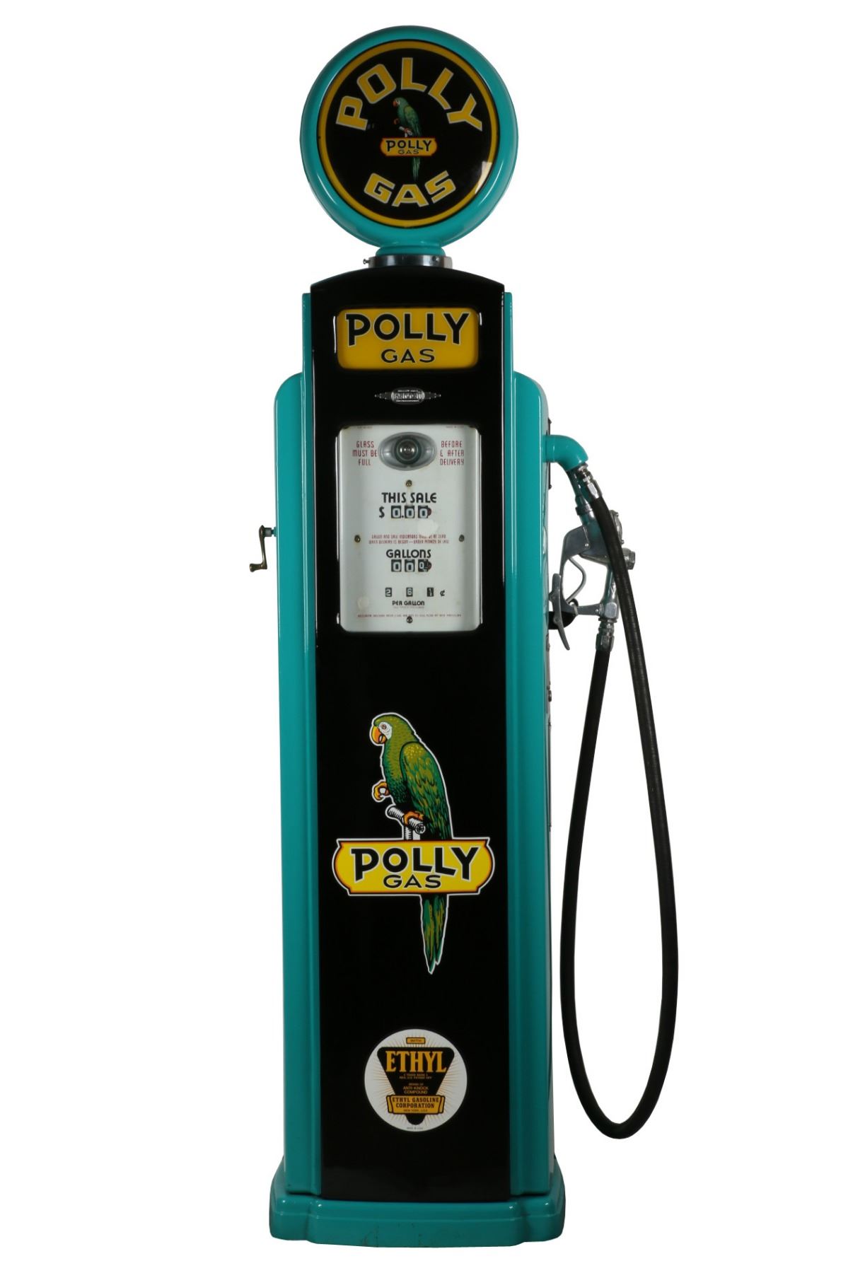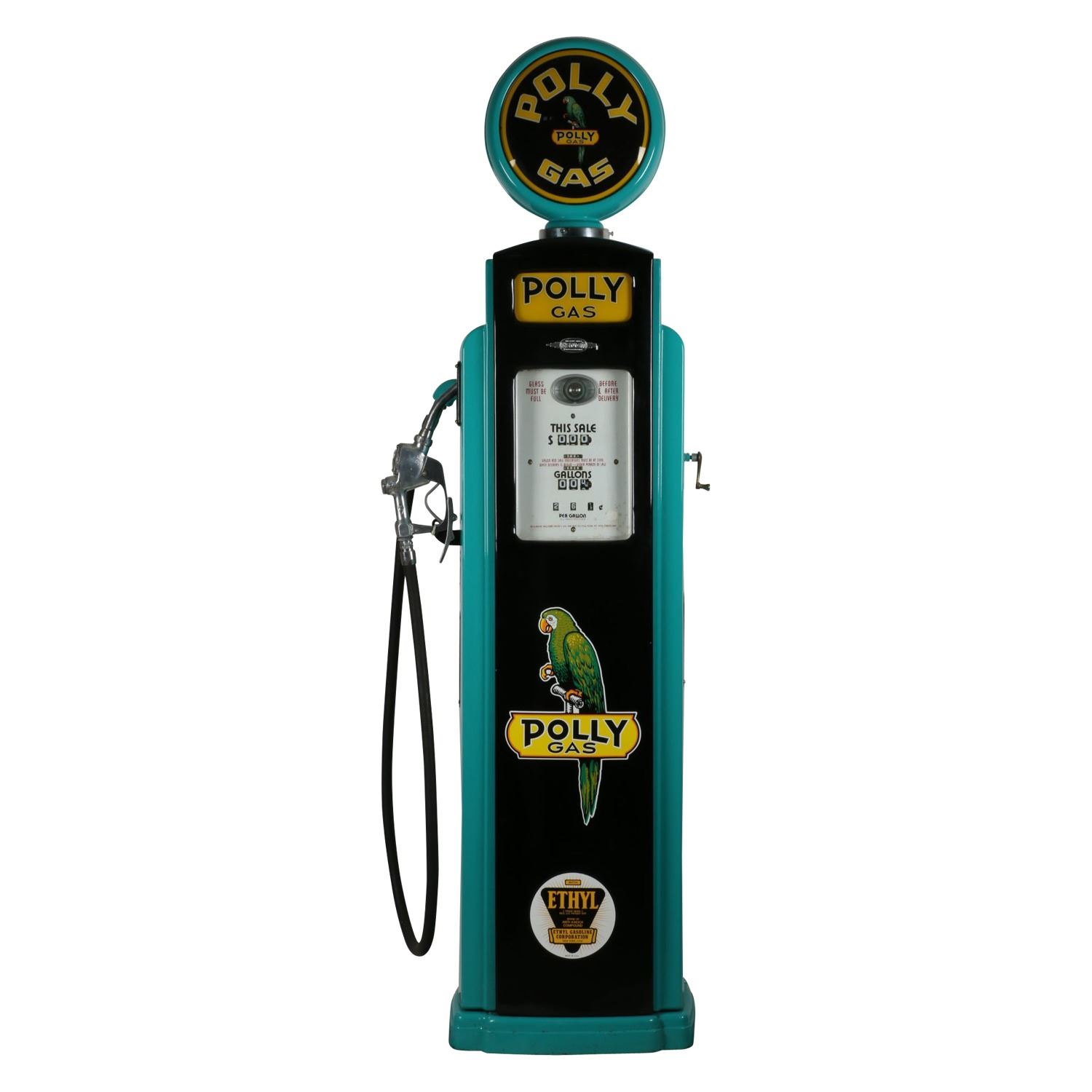 Circa 1940. Bennett Model "541". Restored to "Polly Gas", including matching decals, ad glass and reproduction globe. Lights properly. 72" x 20" x 16" +Globe. Porcelain register faces have a few touch-ups. Interior pumping mechanism removed. Shallow impressions and surface scuffs to the body. $2500-3500.
