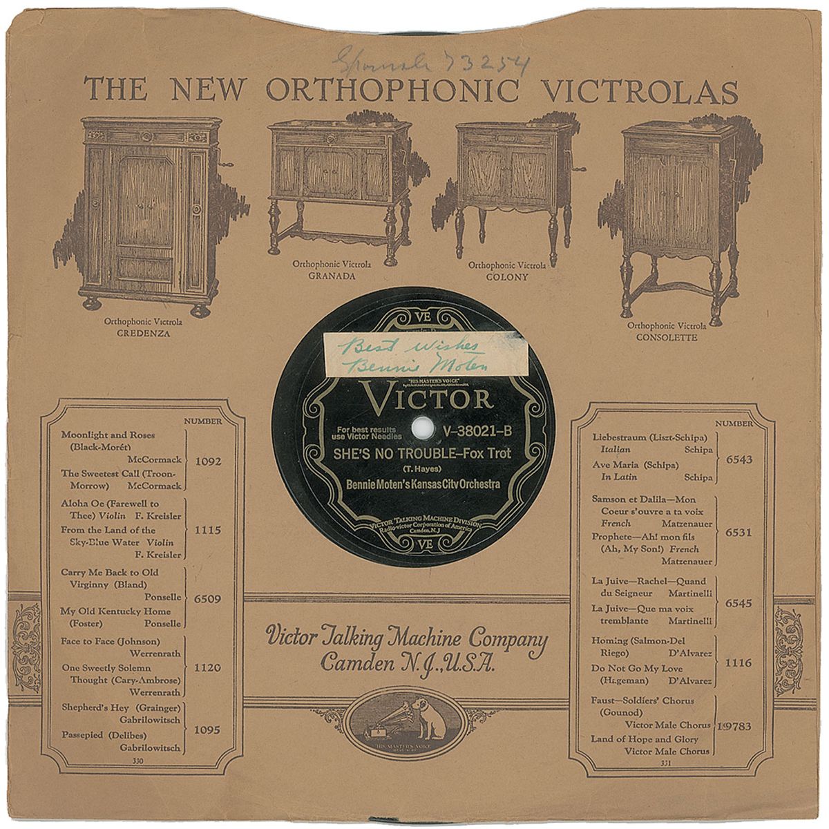 Noted Jazz pianist and band leader (1894–1935). When Moten had a sudden tonsillectomy in 1935, resulting in his untimely death, his pianist Bill Basie took over for a Chicago engagement. Bill Basie went on to become the now legendary Count Basie, his band having been built from the core of the Bennie Moten band. Vintage fountain pen signature, “Bennie Moten,” on an off-white slip affixed to the label of a record for She’s No Trouble. In fine condition. Accompanied by the Victor record sleeve and two unsigned photos of Moten’s orchestra. This is the first example of Moten’s signature both we and expert Larry Rafferty have ever seen.