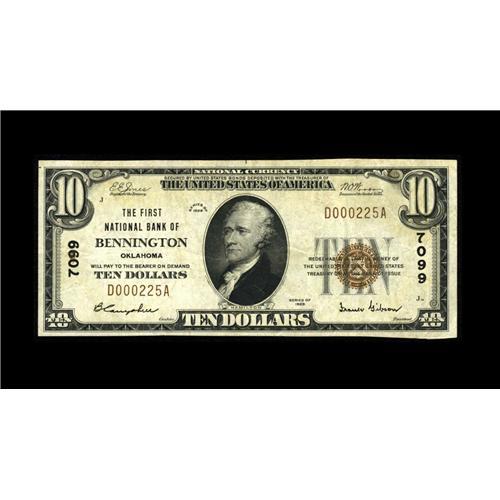 <B>Bennington, OK</B></I> - $10 1929 Ty. 1 <B>The First NB</B></I> Ch. # 7099<BR>This rare note comes from the only collectible bank in this small community. While the occasional large note does turn up from here, Series 1929 specimens are especially difficult to locate, with this one of just two recorded to date. It's considerably the nicer of the pair by several grades as well, no surprise as it comes from one of the greatest Oklahoma collections ever formed. <B>Very Fine.</B></I><BR><BR><b>Shipping:</b> Coin/Currency (<a target="_blank" href="http://www.heritageauctions.com/common/shipping.php">view shipping information</a>)