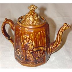 Bennington Pottery Rebecca at the Well teapot. Measures 8" tall. Lid has a few minor chips on finial and around edge.