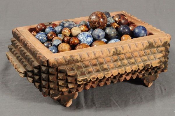 Assorted colors in wood tramp art box, measures approx 9" deep x 12" wide x 4" tall.