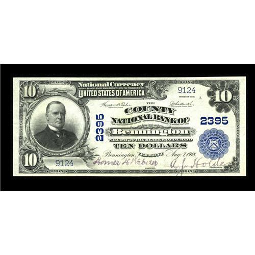 <B>Bennington, VT</B></I> - $10 1902 Plain Back Fr. 632 <B>The County NB</B></I> Ch. # 2395<BR>This nice <B>Extremely Fine</B></I> note bears the second, and somewhat scarcer, of the two titles under which this institution issued large size notes. It last crossed the auction block in 2002, when it sold it for $275. We note that it is one of only three $10 Plain Backs with this title and suspect that the realization will be measurably stronger tonight.<BR><BR><b>Shipping:</b> Coin/Currency (<a target="_blank" href="http://www.heritageauctions.com/common/shipping.php">view shipping information</a>)