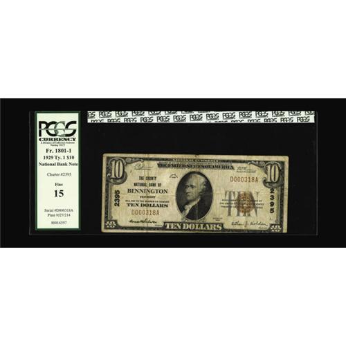 <B>Bennington, VT</B></I> - $10 1929 Ty. 1 <B>The County NB</B></I> Ch. # 2395<BR>A <B>PCGS Fine 15</B></I> note bearing the second of two titles to be utilized here. Bennington was the site of an important military engagement during the Revolutionary War that is commemorated by an impressive monument.
