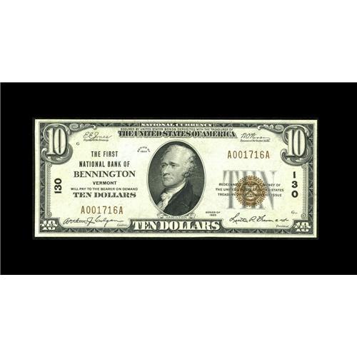 <B>Bennington, VT</B></I> - $10 1929 Ty. 1 <B>The First NB</B></I> Ch. # 130<BR>Arthur J. Colgan and Geo. F. Graves are the signers on this bright <B>Very Fine-Extremely Fine</B></I> example.