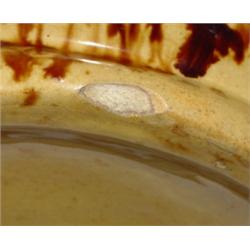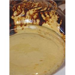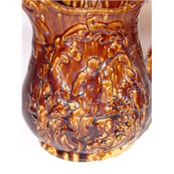 Bennington yelloware handled pitcher. Measures 8 1/2" tall and is embossed with hunter. One small chip is visible on bottom of pitcher.