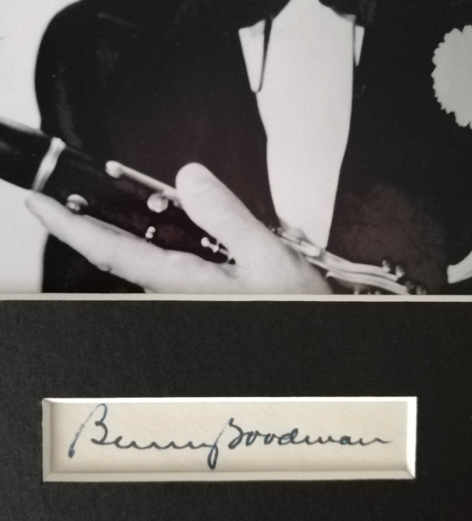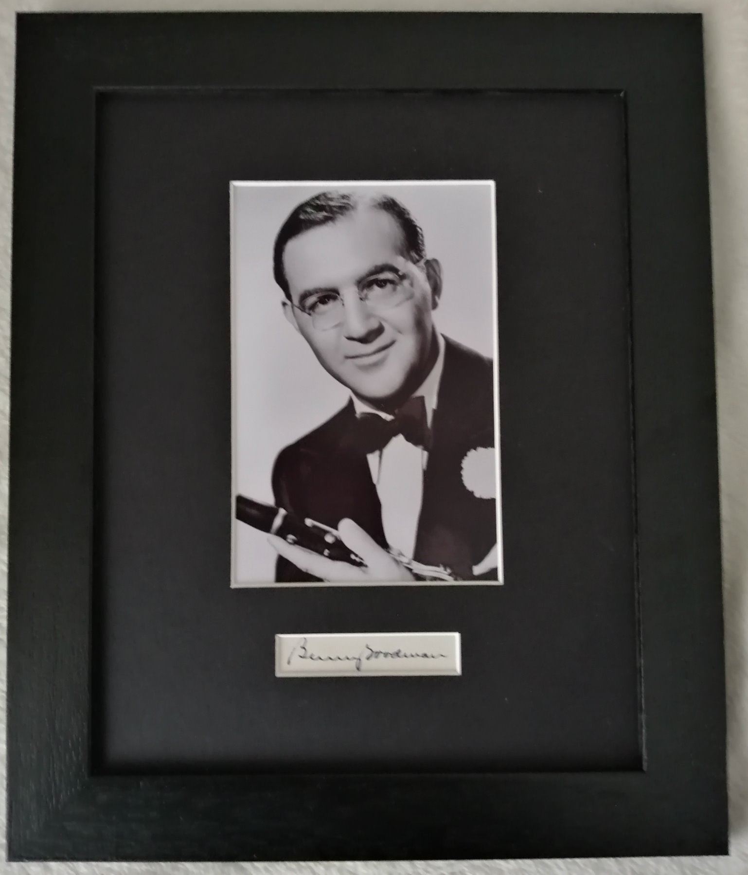 Benny Goodman's autograph is mounted and framed in a wooden frame.