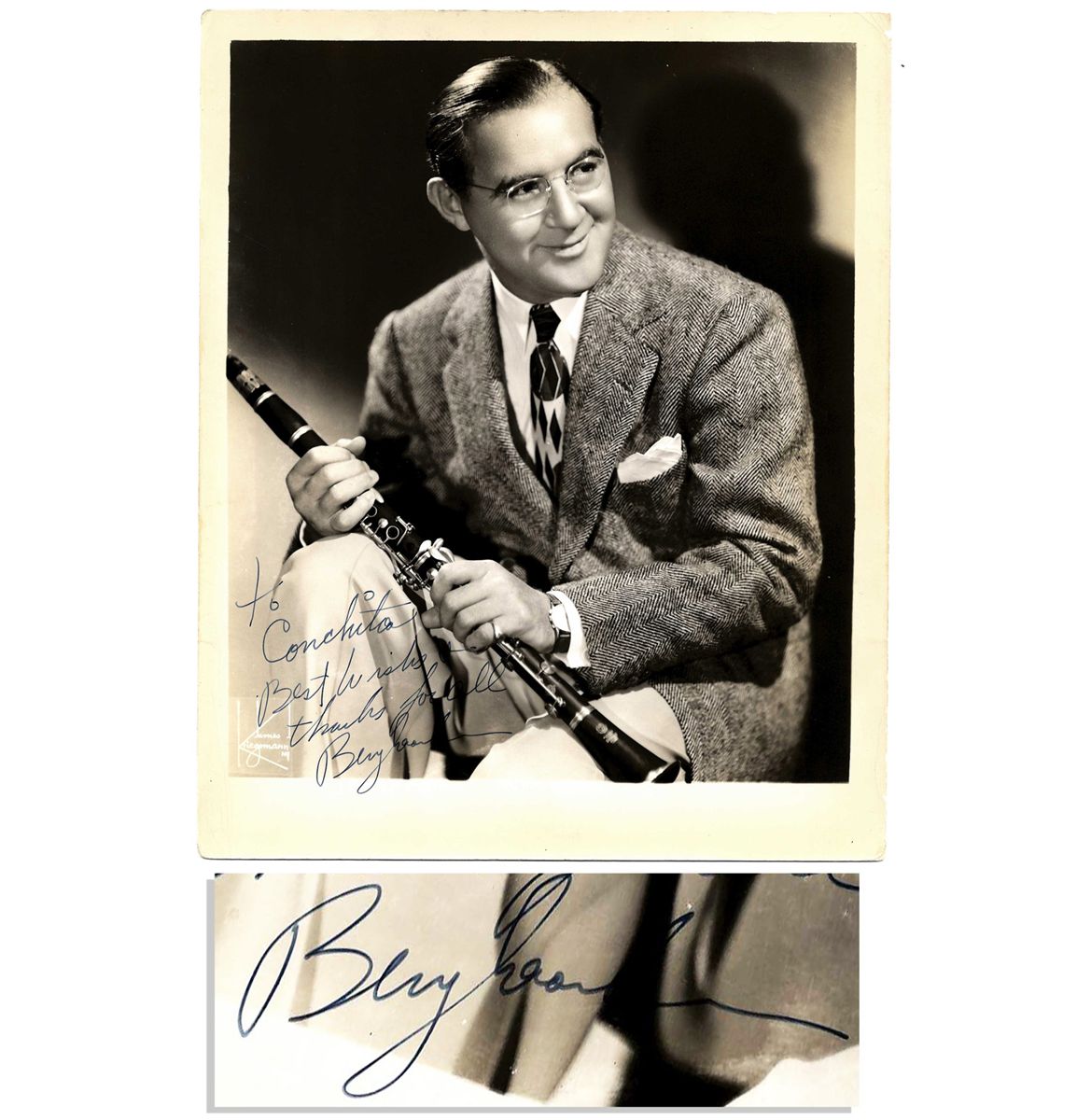 Benny Goodman photo signed. Black and white image of the big band musician posing with his clarinet is inscribed, ''To Conchita / Best wishes & thanks for all / Benny Goodman''. Glossy photo measures 8'' x 10''. Near fine.