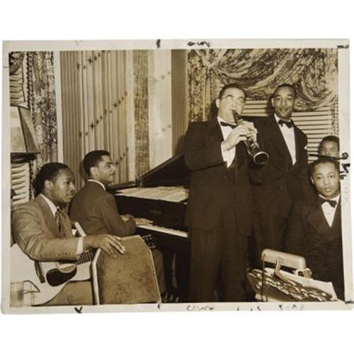 <B>Benny Goodman's Clarinet.</B></I> Dubbed "The King of Swing," Benny Goodman's arrival on the music scene heralded the beginning of the Swing era. Mostly remembered as a band leader, Goodman was also a clarinet virtuoso with a distinctive style. Arguably the most technically proficient Jazz clarinetist of his time, he played the instrument for decades until his death in New York City in 1986 at the age of 77, and in the process inspired many budding musicians to take up the instrument. This Selmer Paris K Series Bb clarinet was made between 1930 and 1931, and purchased by Goodman in New York City in the spring of 1932, according to Goodman's insurance records. An accompanying letter of authenticity from the executor of Goodman's estate confirms the serial number (K1890) referenced in Goodman's records and lists performances in which he used this clarinet, including Goodman's pivotal appearances on the radio show <I>Let's Dance</B></I> in 1935, which launched his career. Also included is an original 8" x 10" of Goodman playing the clarinet with his pianist Teddy Wilson. The instrument has been well-used but is still in great condition, with pads and corks intact. A wonderful item whose significance in the history of music is immeasurable.<BR><BR><b>Shipping:</b> Musical Instruments, Large (<a target="_blank" href="http://www.heritageauctions.com/common/shipping.php">view shipping information</a>)