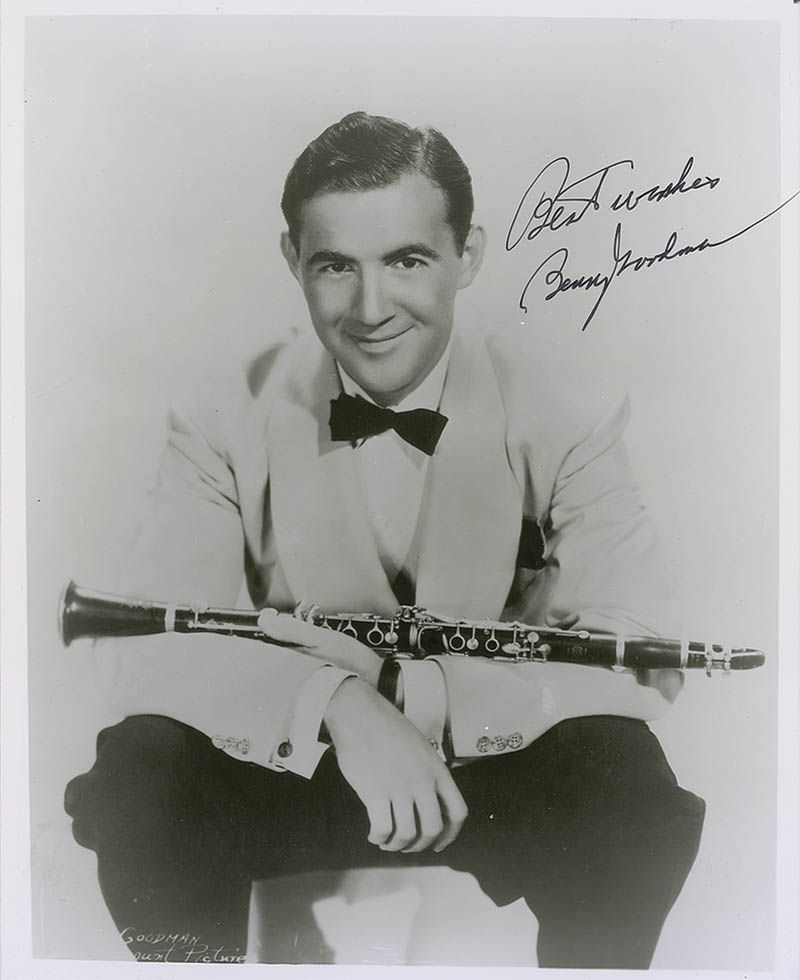 Glossy 8 x 10 photo of Goodman posing with his clarinet, signed in black felt tip, “Best wishes, Benny Goodman.” In fine condition.