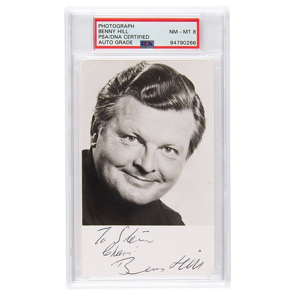 Vintage glossy 3.25 x 5.5 close-up photo of the English comedian, signed and inscribed in the lower border in black ballpoint, "To Steve, Cheers! Benny Hill.& rdquo; In fine condition, with a small crease to the upper left corner tip. Encapsulated and graded by PSA/DNA as "NM-MT 8."