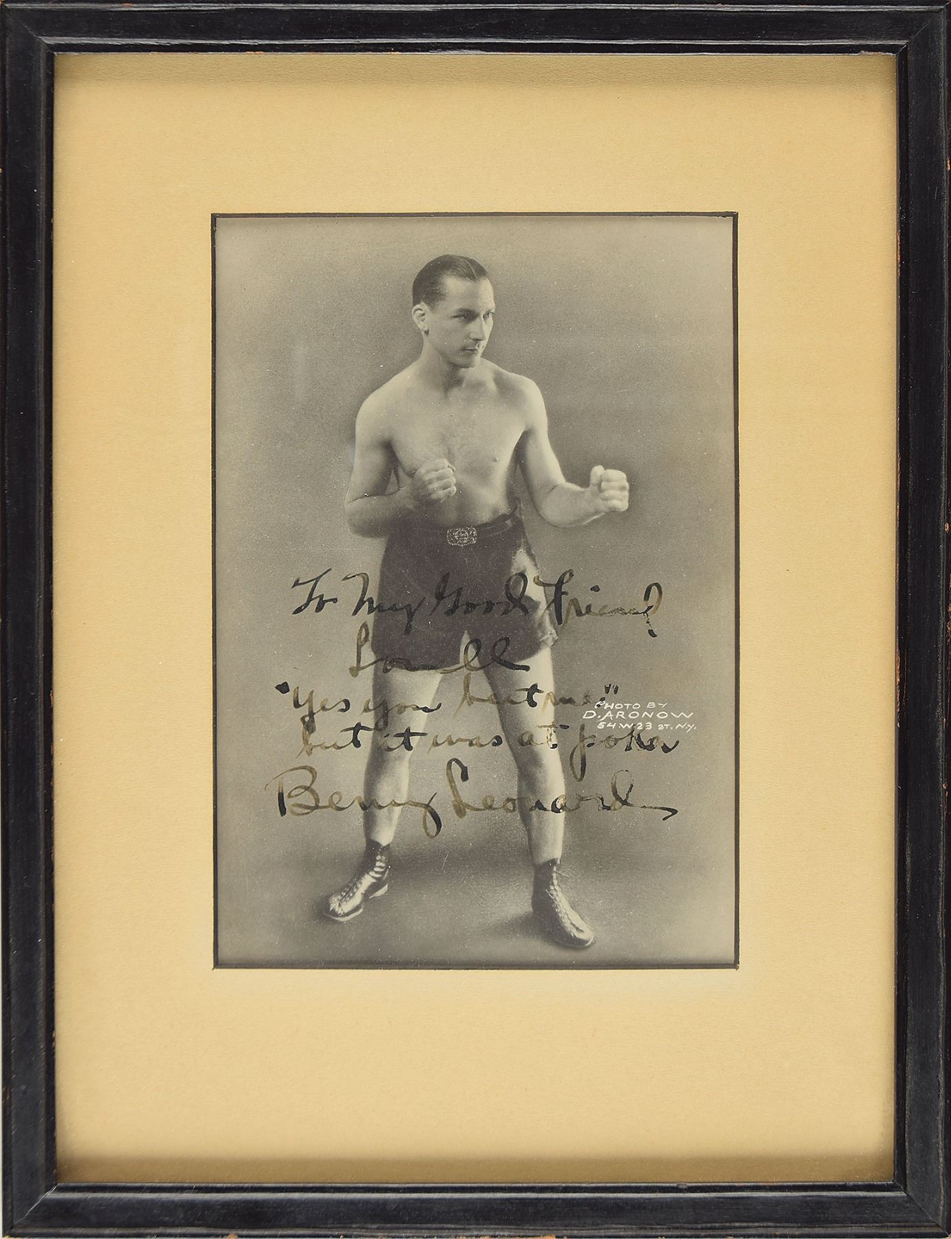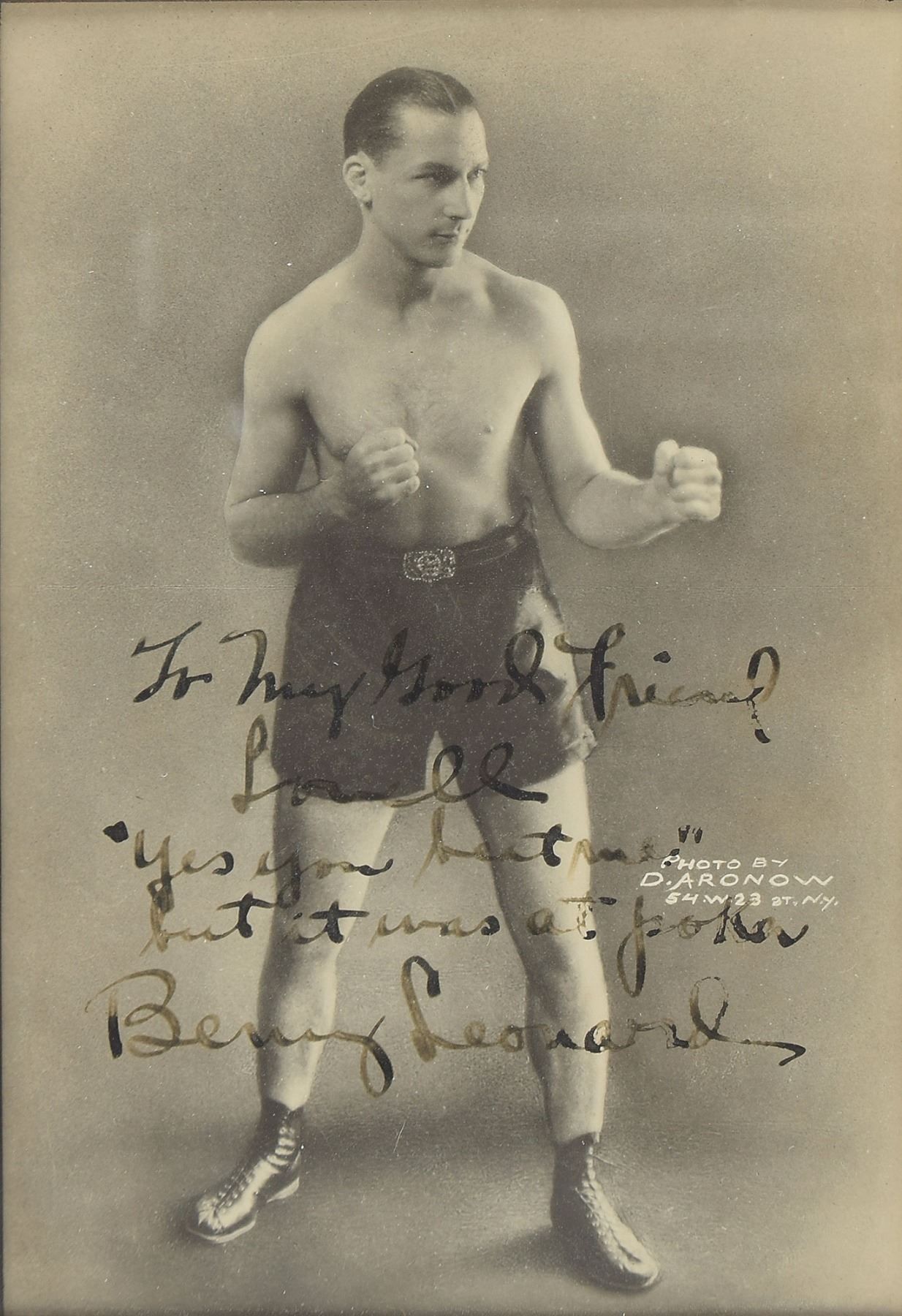 Vintage matte-finish 4.5 x 6.5 photo of the of the Jewish boxing legend in a pugilistic pose, signed and inscribed in fountain pen, "To My Good Friend Lovell, 'Yes you beat me' but it was at poker, Benny Leonard.” Matted and framed to an overall size of 8 x 10.5. In fine condition.