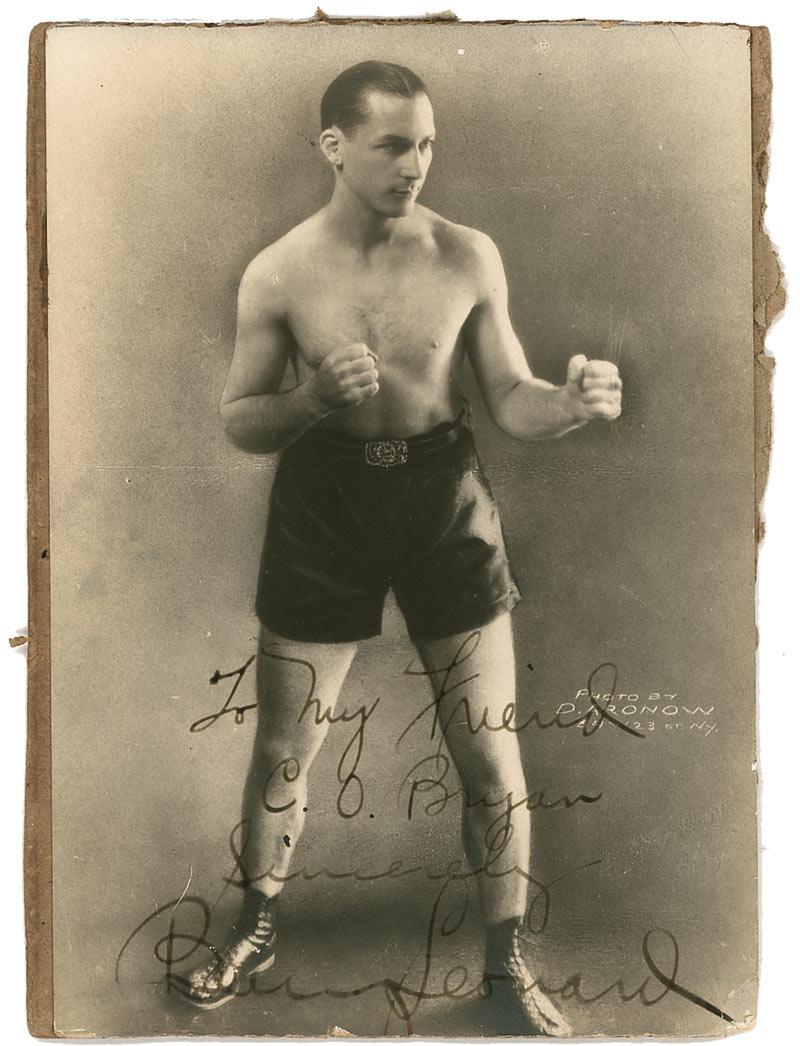 Great lightweight boxing champion of the world, 1917–1925. Vintage 3.5 x 5 photo of Leonard with his “dukes” up, signed and inscribed in fountain pen “To my friend, C. O. Bryan, Sincerely, Benny Leonard.” Photo is affixed to an identical size piece of heavy cardboard. Lightly trimmed edges, some scattered light silvering, and a crease to lower right corner, otherwise fine condition. Pre-certified Steve Grad/PSA/DNA and RRAuction COA.