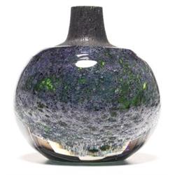 Benny Motzfeldt vase, for Randsfjord Glass, Norway, small and heavy form in blue and green glass cased in clear with textured charcoal bark decoration at neck, paper label, 4”h