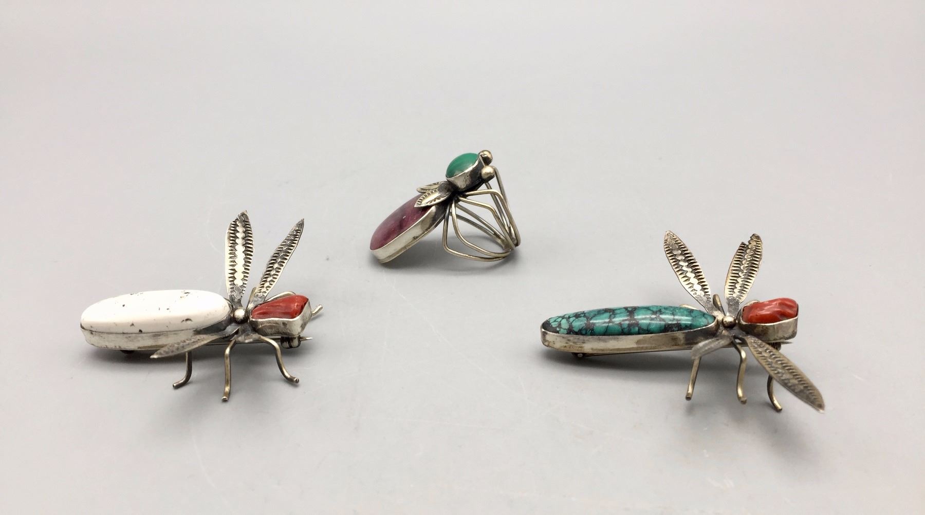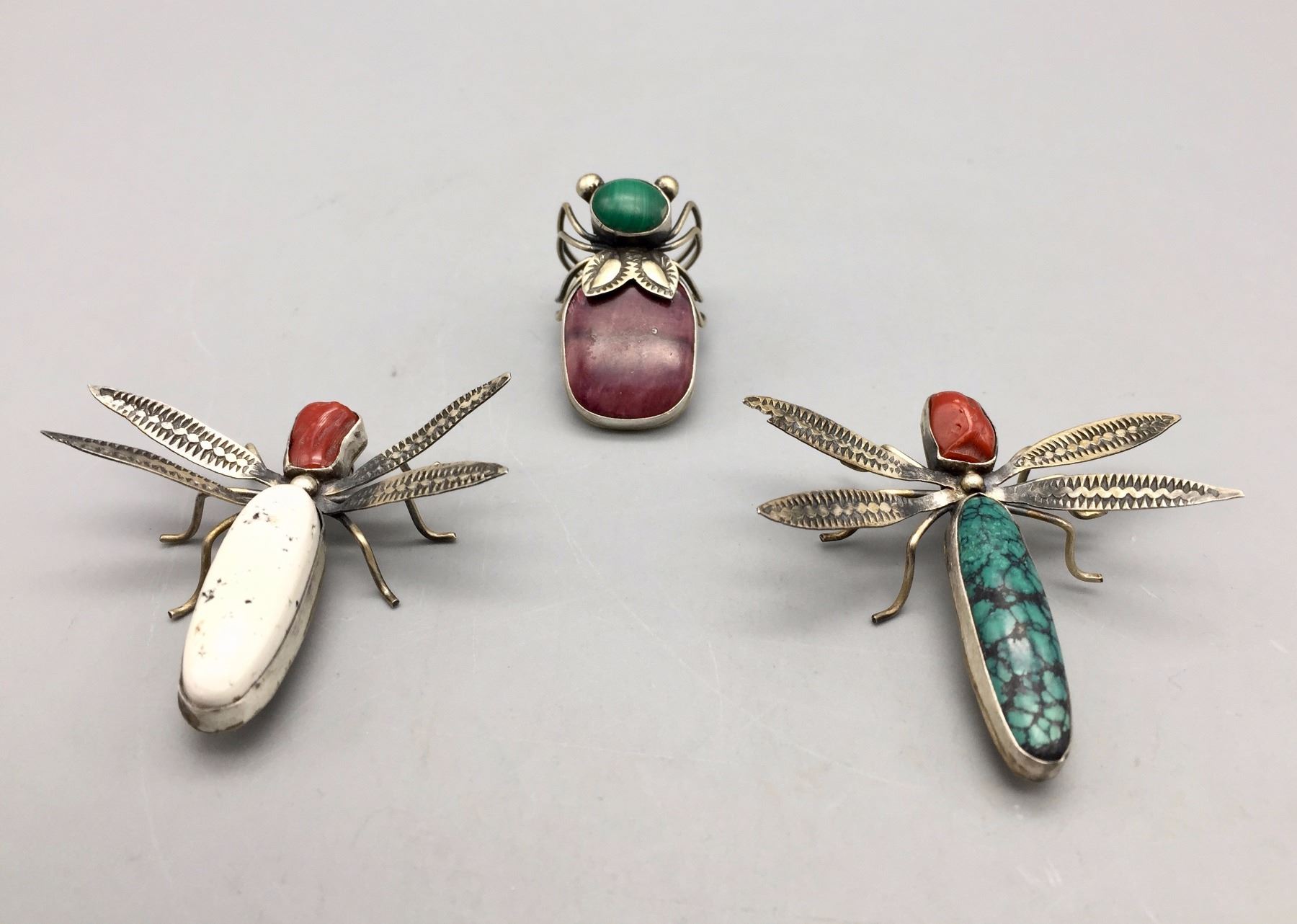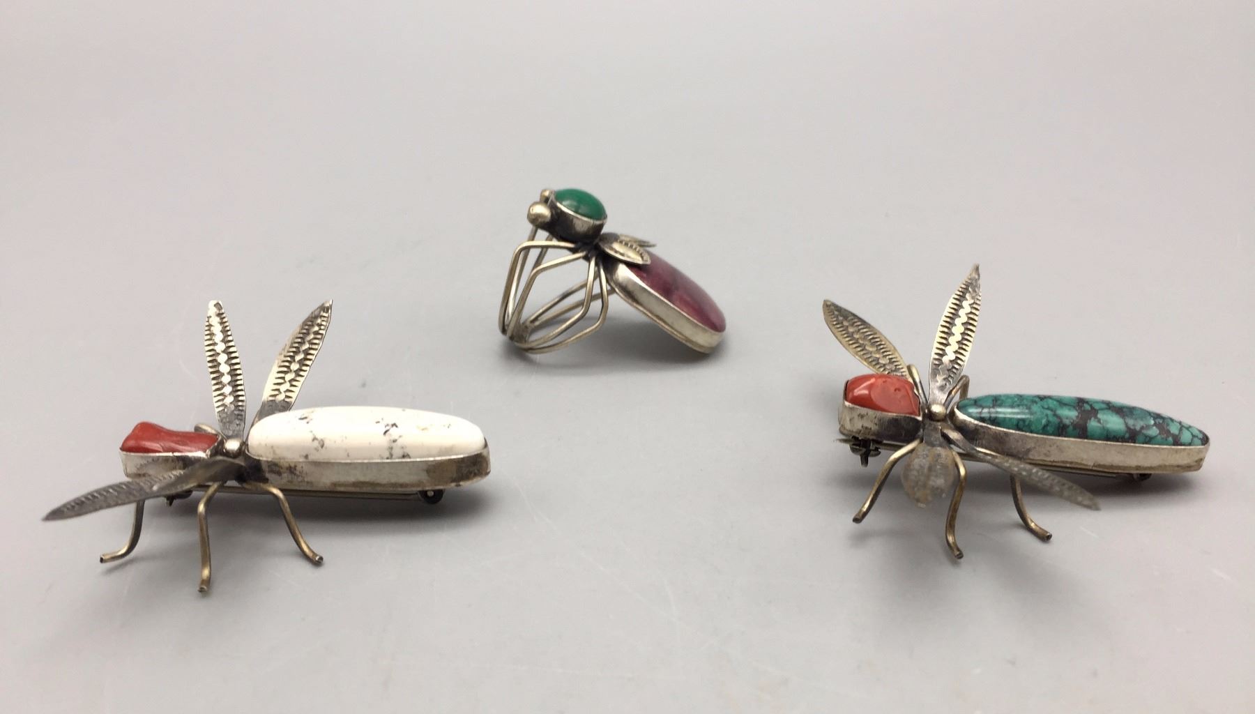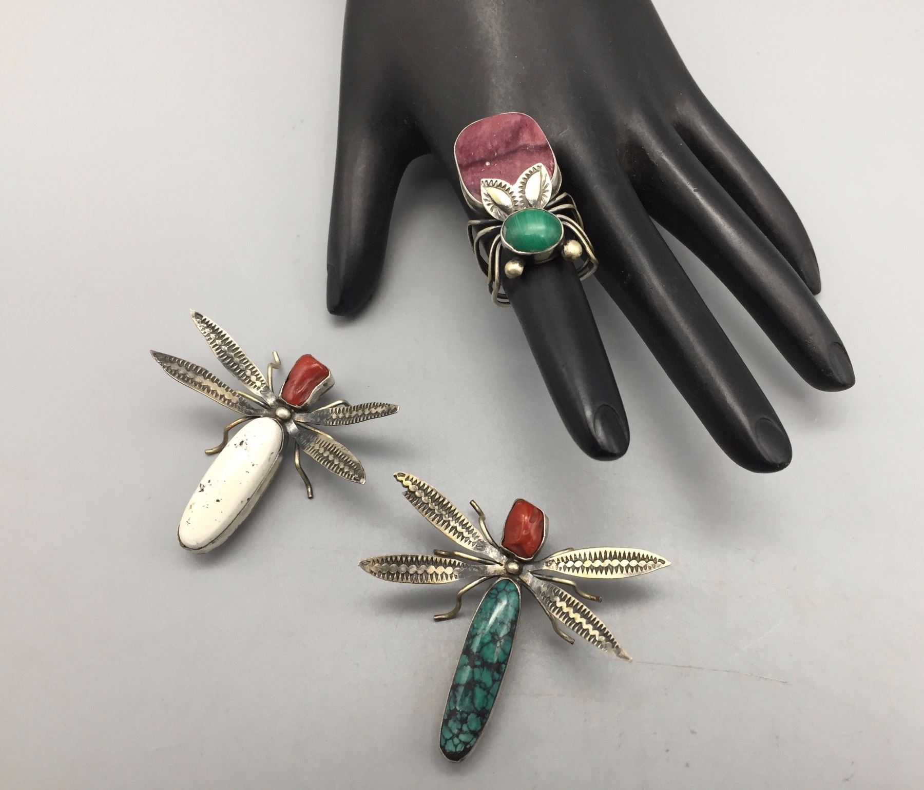 Description: 2 pins and a ring by Benny Ration. Maker: Hallmark, Benny Ration. Approx. Age: Fairly contemporary. Size: Pins are approx. 1 5/8” l x 1 7/8” w. Ring is size 7, 1 3/8” l and all three pieces weigh 25.5 g. Condition: Good for its age, normal wear expected. Please look closely at the pictures - they are an important part of our description. Shipping: There will be a $5 handling / packaging fee for shipping this lot. The actual cost of postage will be added on top of that.