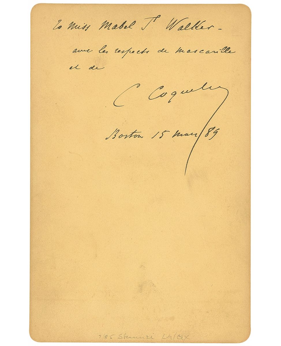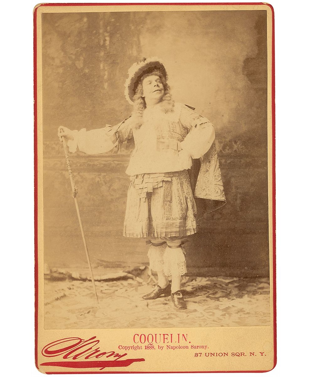 French actor (1841–1909) considered one of the greatest theatrical figures of his age; known for his appearances with Sarah Bernhardt and in Cyrano de Bergerac. Original 4.25 x 6.5 cabinet photo of Coquelin in costume by Sarony of New York, signed and inscribed in French on the reverse in black ink, and dated May 15, 1889. In fine condition, with mild overall toning.