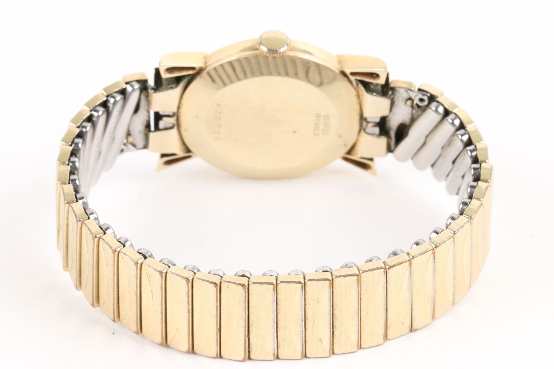 CIRCA: 1940s. CASE MATERIAL: 14k Yellow Gold. DIAL DIAMETER: 27mm. BRACELET MATERIAL: 14K Gold. MOVEMENT: Manual Wind. FEATURES: Art Deco design. WEIGHT: 42.1g. Est. $300-400 DISCLOSURE: Watches were running at time of photography unless otherwise stated. Service history is unknown unless paperwork is provided. We cannot guarantee accuracy of any of the watches offered. "