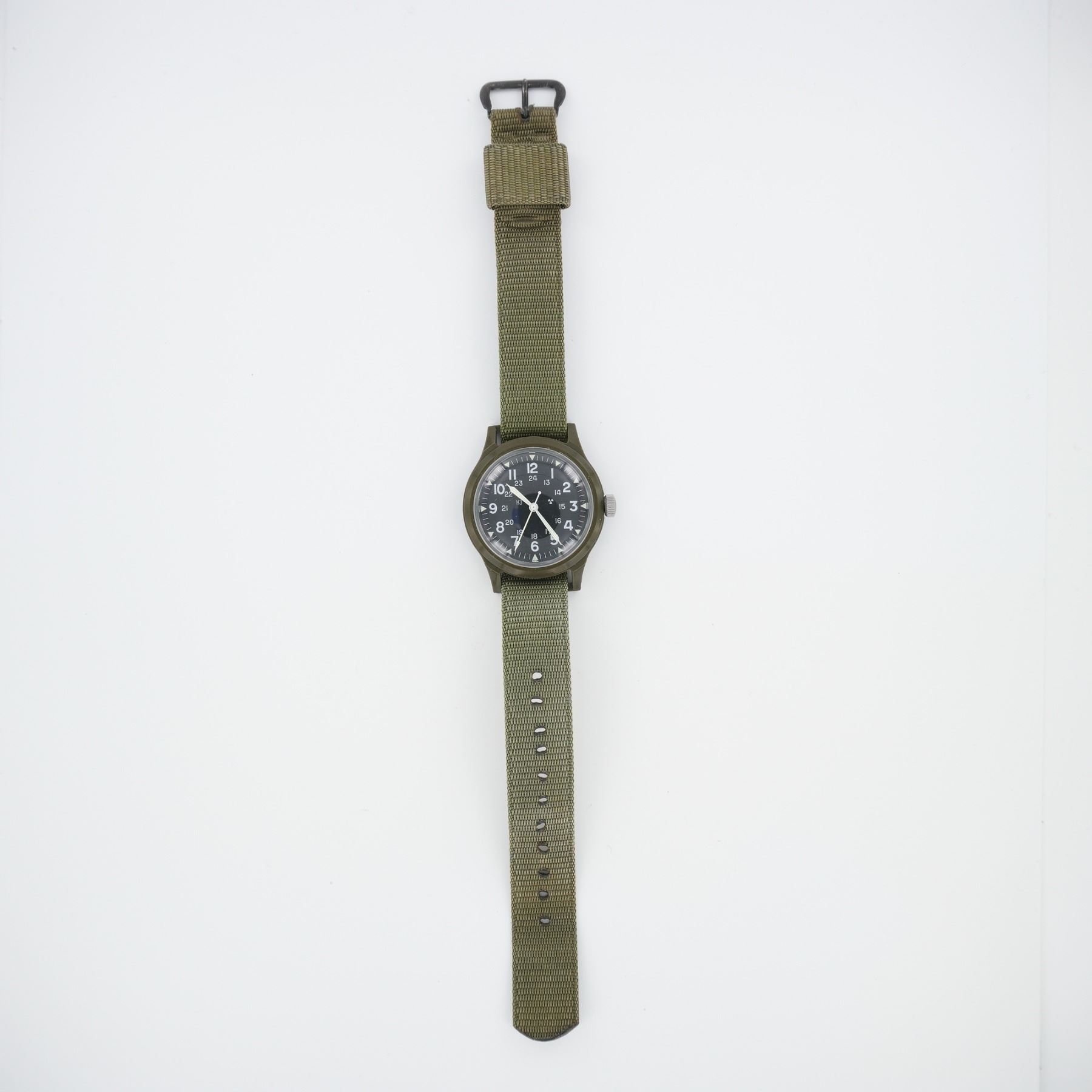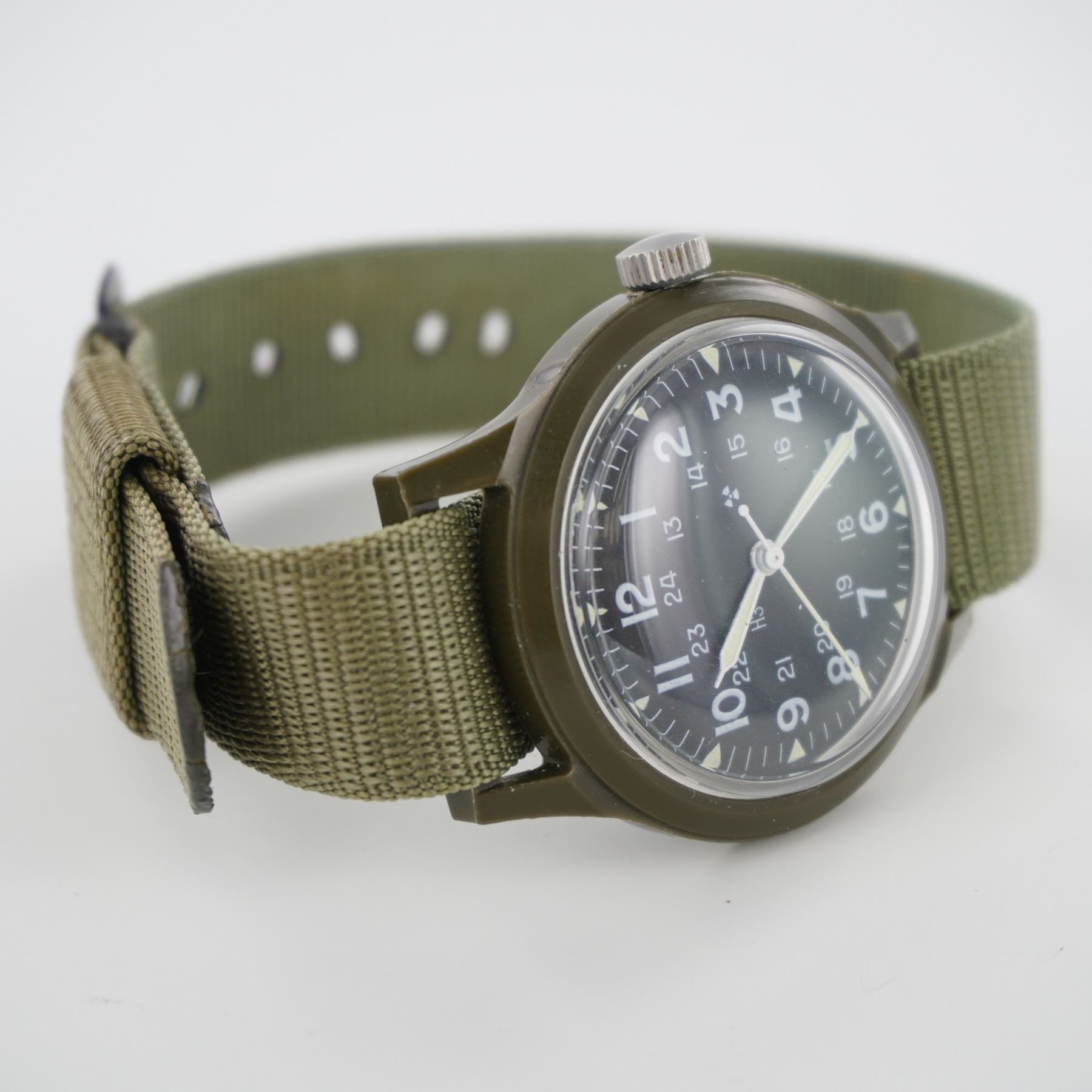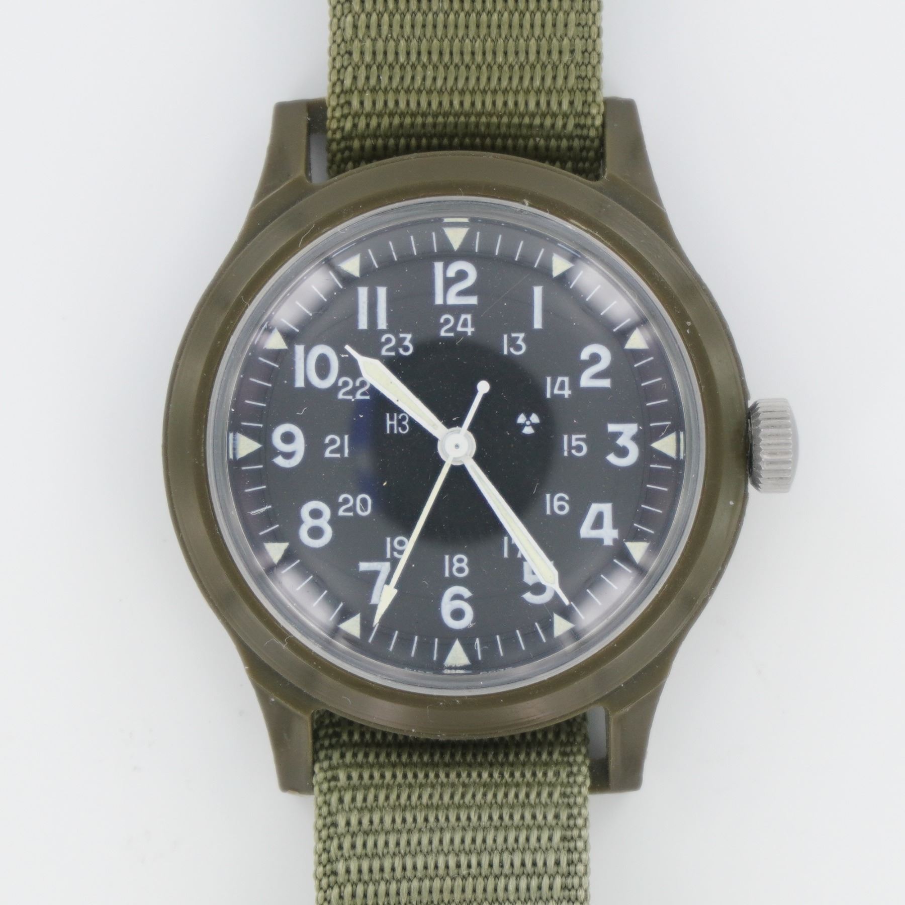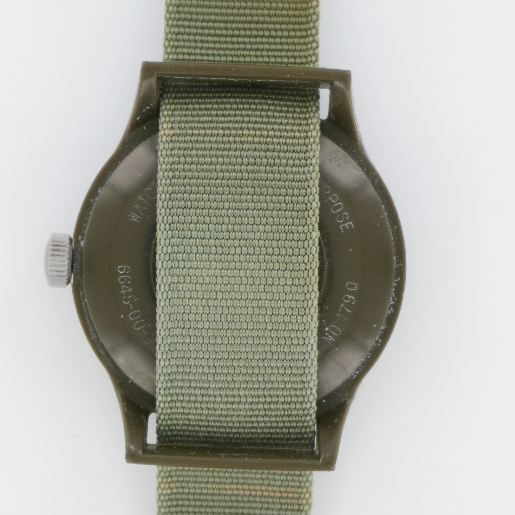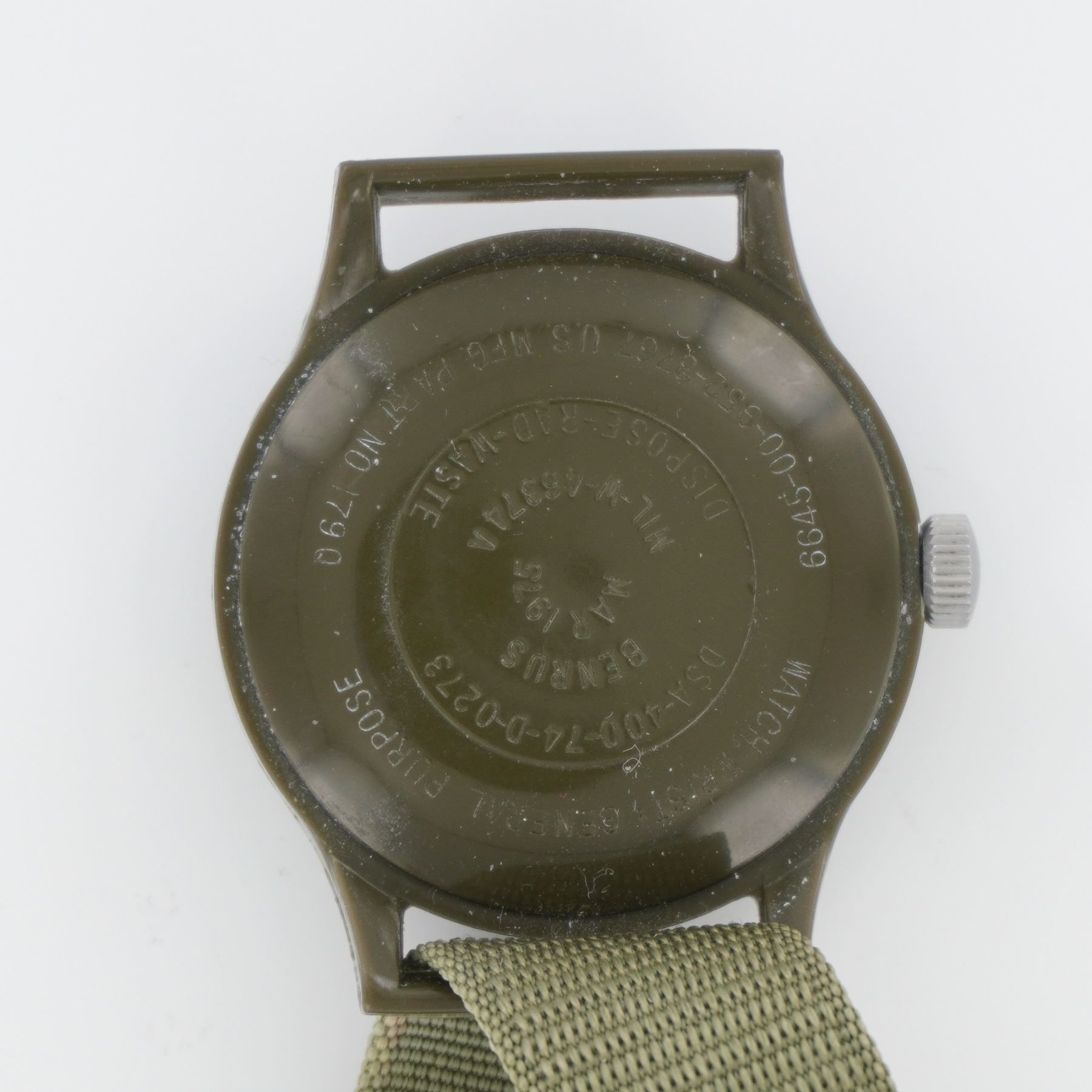 U.S. Army issue general purpose wristwatch produced by Benrus under contract DSA-400-74-D-0273, dated March 1975. Black dial with luminous H3 hands, 12/24-hour numerals, and matte finish for low reflectivity. Olive composite case marked "WATCH, WRIST: GENERAL PURPOSE" and "MIL-W-46374A," fitted with screw-down stainless steel back. Manual wind movement with olive nylon NATO strap. A Vietnam-era specification field watch designed for durability and legibility in military service.