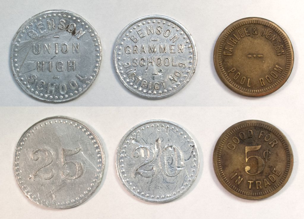 (3) Benson Grammer (SIC - Grammar) School // 20 & Benson Union High School //25 Aluminum & Fairlee & Jensen Pool Room // 5¢ Brass Two scarce school tokens used from 1916-1940, a pool hall token used from 1907. -1917 - wonder if the school children skippedMisspelled School Tokens & Pool Hall