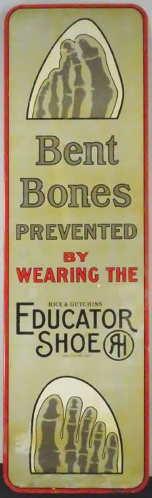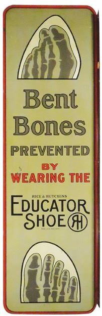 Bent Bones Tin Flange Sign, two sided. One side has a few light scratches otherwise very good condition. Other side has scratches and discoloration, mostly at bottom. 10 1/2 X 35 1/2 inches.