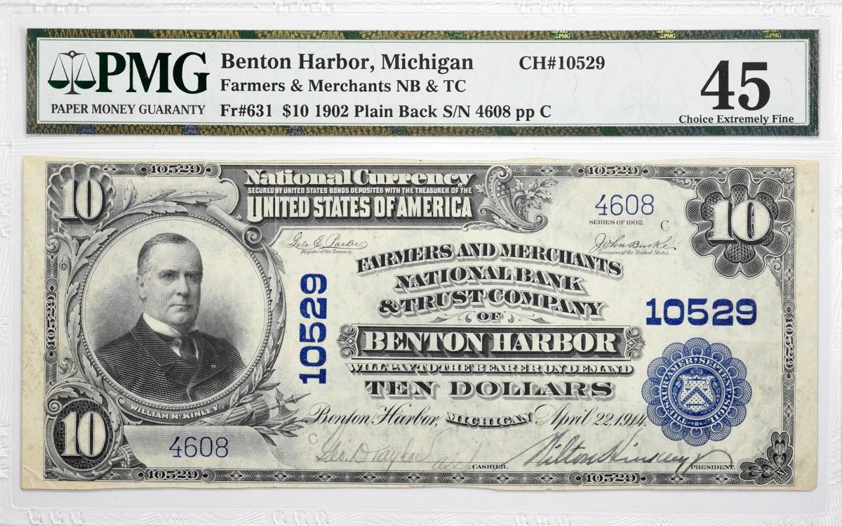 Benton Harbor, Michigan. $10 1902 Plain Back. Fr. 631. Farmers and Merchants NB & TC. Charter 10529. PMG Choice Extremely Fine 45. The first of an impressive pair we are offering on this charter with both notes having came from the same sheet. Just trivial circulation along with bold banking signatures. Seen with the second title used by the bank and certainly of quality that is among the finest known.