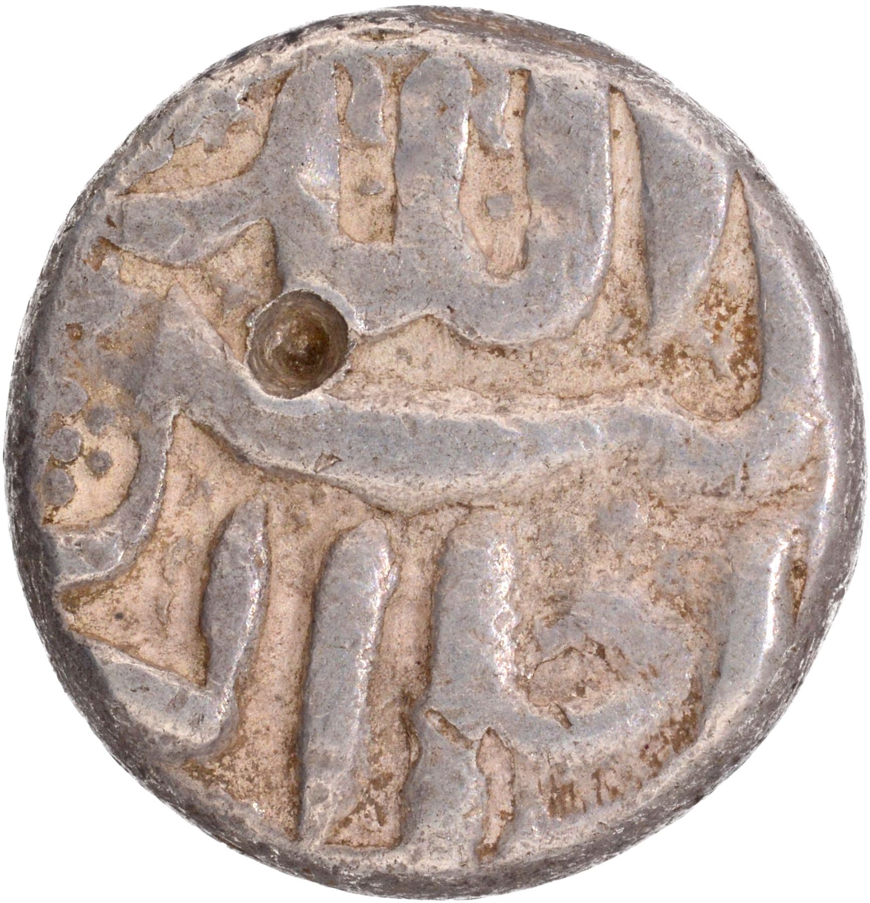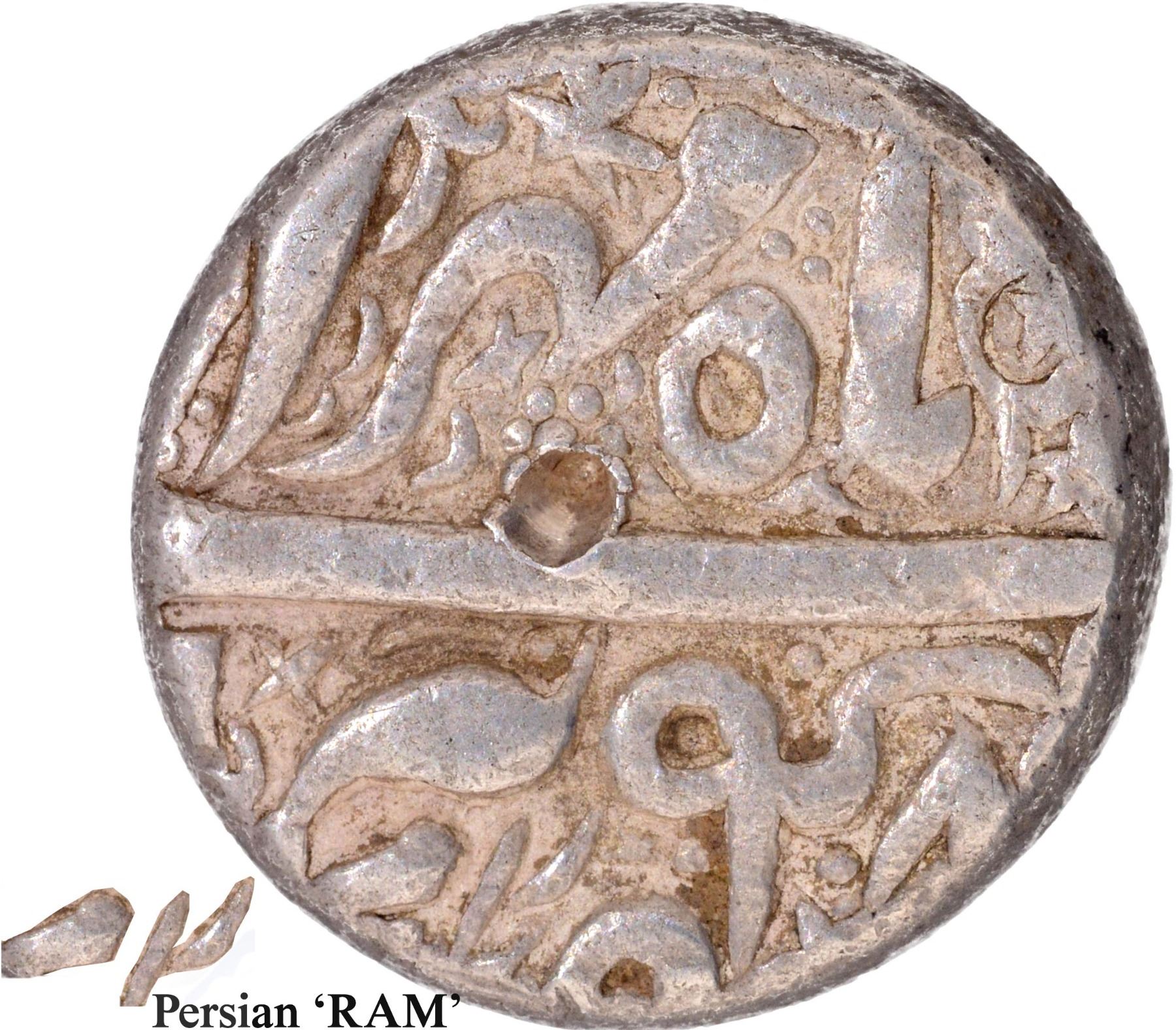 Akbar (AH 963-1014 /1556-1605 AD), Berar Mint, Silver Rupee,MonthMihr (Libra),Ram Type, Elahi 48, Obv:Arabic legend Jalla Jalalahu Allahu Akbar,Rev:Persian legend with the month Mihr at the top, zarb Berar with a RAM in Persian wordsat the bottom,11.30g,17.60mm,(KM # 93.6),test marks on bothsides, about very fine, Scarce.
