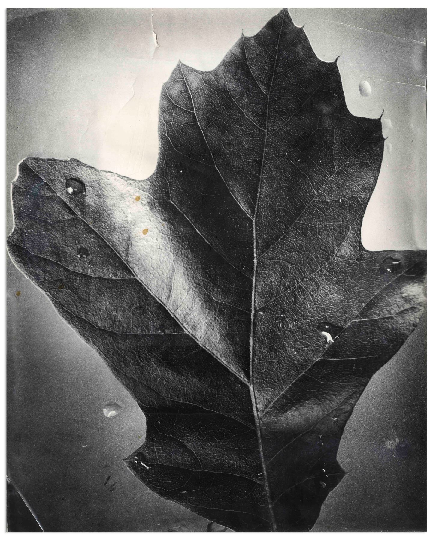 Berenice Abbott silver gelatin print of ''Leaf, Supersight'', circa early 1940s when Abbott was taking precise and close-up photos deemed Supersight. Semi-glossy photo measures 15.125'' x 19.25'', with Abbott's Maine address stamp to verso. A few spots of discoloration and creasing throughout, as well as closed 1.5'' tear at bottom edge. Overall in fair to good condition. Acquired by John Robert Tennant Sr., photographer for the Smithsonian's National Gallery of Art, and the Hirshhorn Museum and Sculpture Garden, and then by descent to consignor.