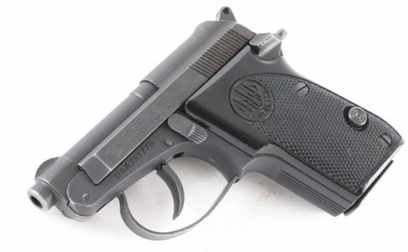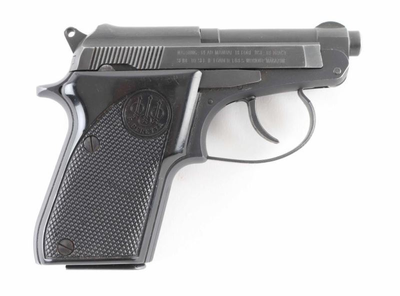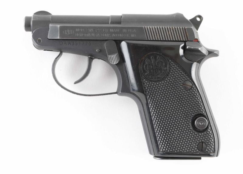 Semiautomatic rimfire pistol made in the USA. This model incorporates a tip-up barrel to allow loading or unloading the chamber without a need to operate the slide. Features blued finish, checkered black plastic grips with Beretta logo, double/single action trigger, 2.4" barrel, fixed sights, frame mounted safety, push button magazine release towards bottom of grip, single stack magazine. Bore is very good condition. Retains 95% finish with edge losses, handling marks. Includes (1) magazine, black nylon pocket holster. Condition is NRA Very Good++ *** Modern Firearm ***