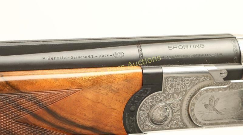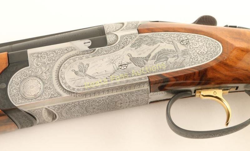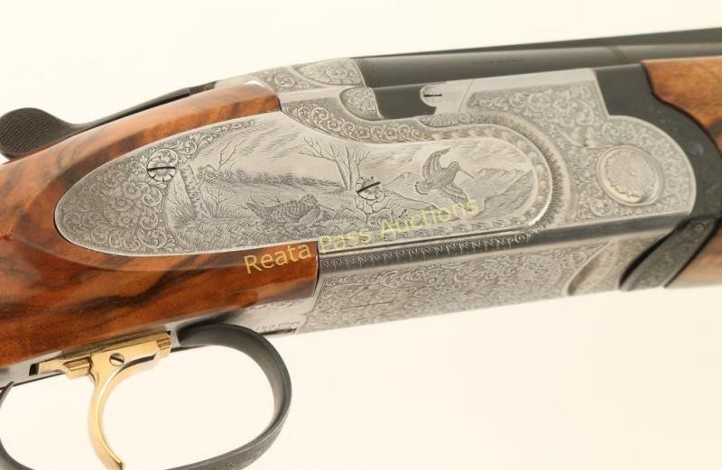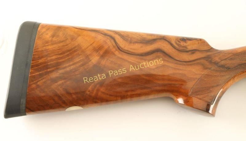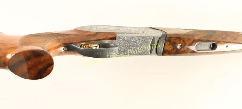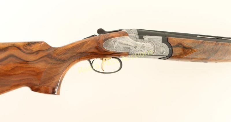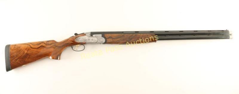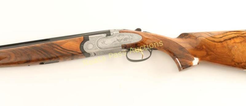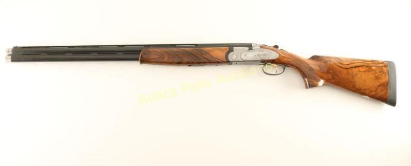 'Diamond Pigeon' Beautiful Italian made under/over double barrel shotgun chambered for 2 3/4" & 3" 12 gauge shells and finely engraved & signed by master engraver Bottega C Giovanelli, circa 1994. Features matte blued 28" barrels with ventilation ribs & light modified/improved cylinder removable chokes, automatic ejectors, white bead front sight, silver bead mid-sight, master engraved coin finished receiver with ornate game bird scenes surrounded by beautiful floral scroll, adjustable single smooth gold trigger, sliding tang safety with barrel selector, high gloss checkered walnut Schnabel forend and pistol grip shoulder stock with Kick-Eez recoil pad(14 1/4" LOP with it's current trigger position). Shotgun exhibits approximately 97% of it's original finish with only a few light scratches/handling marks observed on the barrels and triggerguard. Action is crisp, bores are pristine and wood stocks are near fine with a few light dings on the left side of the shoulder stock. Condition is excellent. ***Modern Firearm***