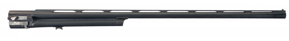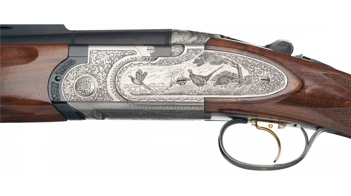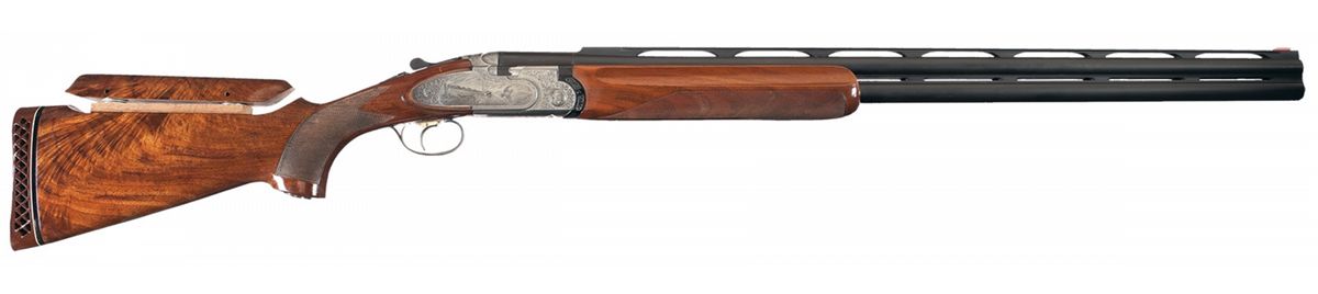 Manufactured circa 1991, there is an orange fiber optic front sight and white mid bead, bottom barrel is fixed full with the top barrel threaded for chokes with a full installed, 2 3/4 inch chambers with lengthened forcing cones and ejectors. The left side plate has a pheasant game scene engraving with floral scroll and the right side has a woodcock game scene with floral scroll. The trigger guard has "TRAP" inlaid in gold, the trigger is position adjustable and there is a tang safety/selector switch. Mounted on a nicely figured checkered walnut forearm and pistol grip stock with silver "M" grip cap, silver initial oval, custom adjustable comb and Pachmayr White Line recoil pad. Length of pull is 14 5/8 inches. With a 32 inch top single barrel numbered to the gun with white bead sights, threaded for choke tubes without one installed and a 2 3/4 inch chamber with lengthened forcing cone and ejector.