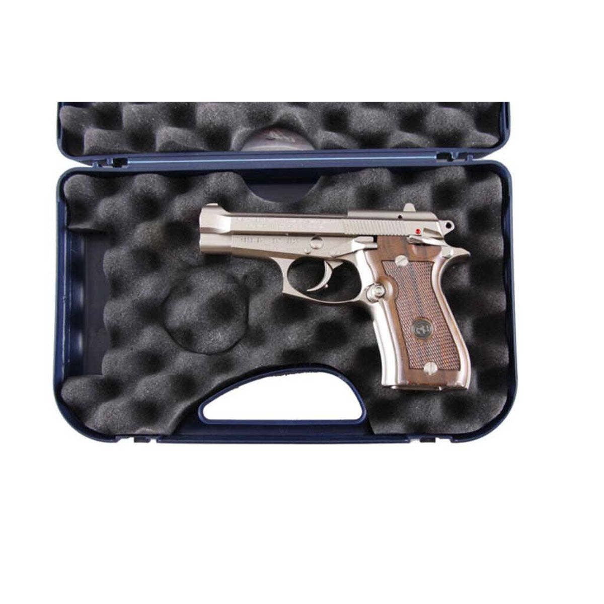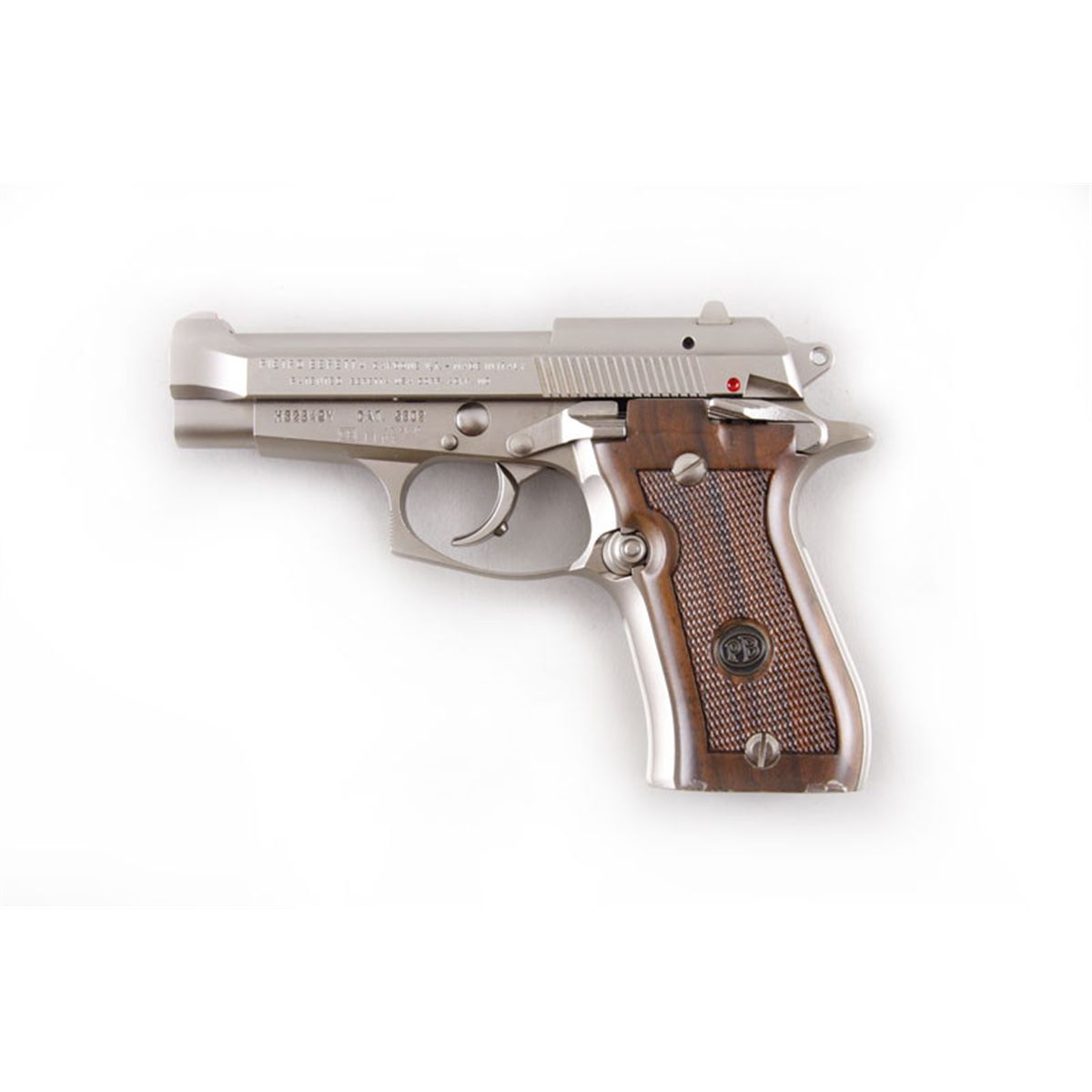 Beretta 84FS Cheetah Cal .380acp SN:H32849Y Double action/Single action 13 shot semi-auto pistol with ambidextrous decocker made in Italy. Brushed stainless steel open top slide and alloy frame, brown wood checkered grips, 3 3/4" barrel with 2 dot fixedDouble action/Single action 13 shot semi-auto  pistol with ambidextrous decocker made in  Italy. Brushed stainless steel open top slide  and alloy frame, brown wood checkered grips,  3 3/4" barrel with 2 dot fixed sights, goodbore and action.The grips have 2 chips on the bottom left side. Included in  grey box, blue  plastic carry case, instructions, cleaning  kit, and gun lock. Condition: Excellent  with little sign of  use. No magazines.