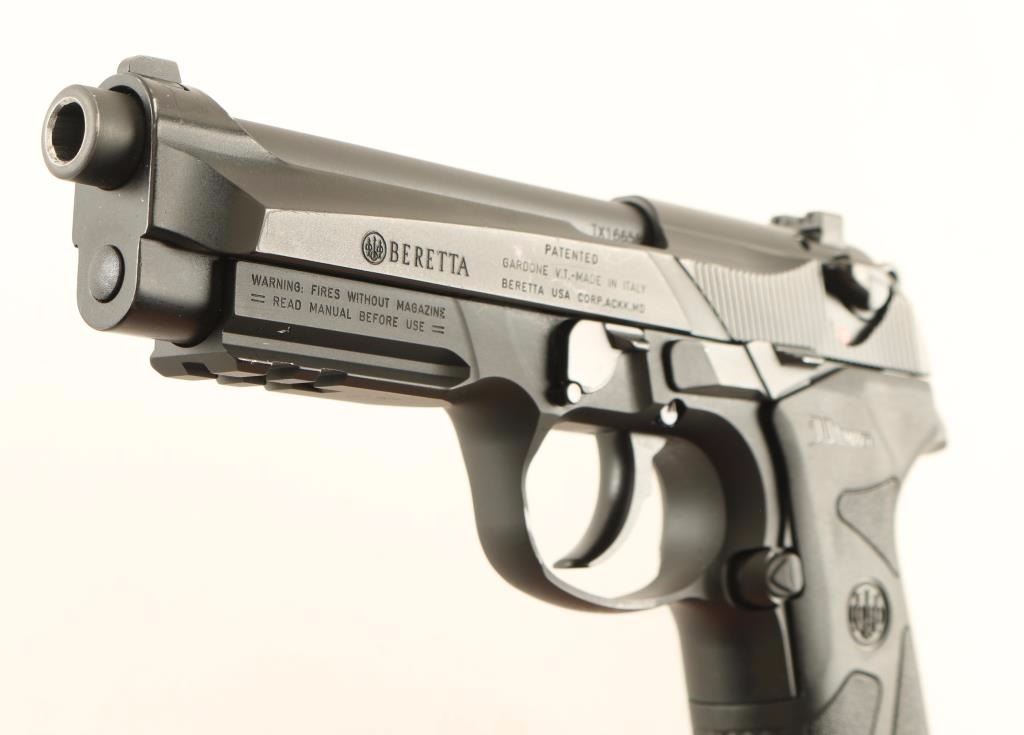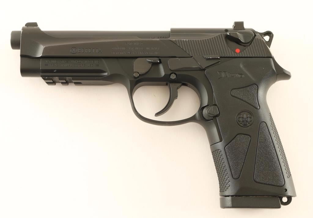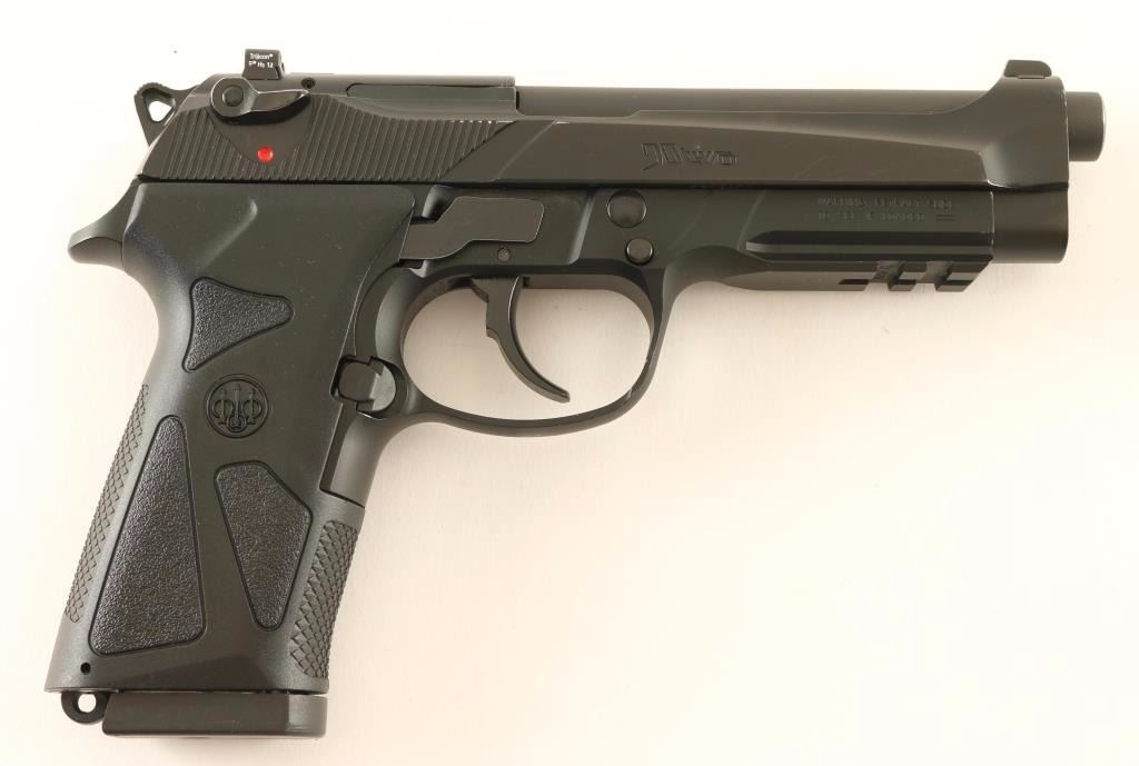 Italian made double action semi-automatic pistol chambered in 9x19mm, circa 2010. Features a matte black finish, 5" barrel, dovetailed three-dot night sights, ambidextrous decocker, push button magazine release, 17 round factory magazine, smooth trigger, alloy frame with integral accessory rail & lanyard loop, and Beretta one-piece textured black synthetic grip. Pistol exhibits approximately 93% of it's original finish showing light edge wear, slide wear on the barrel and some scattered handling marks/scratches. Action is smooth, bore is excellent, and synthetic grip in fine. Condition is very good+++. ***Modern Firearm***