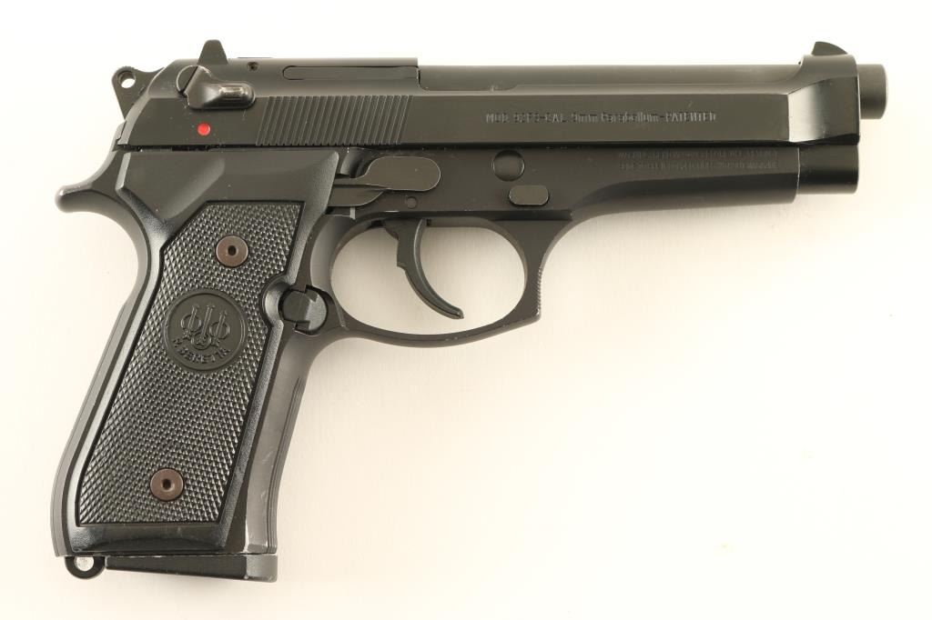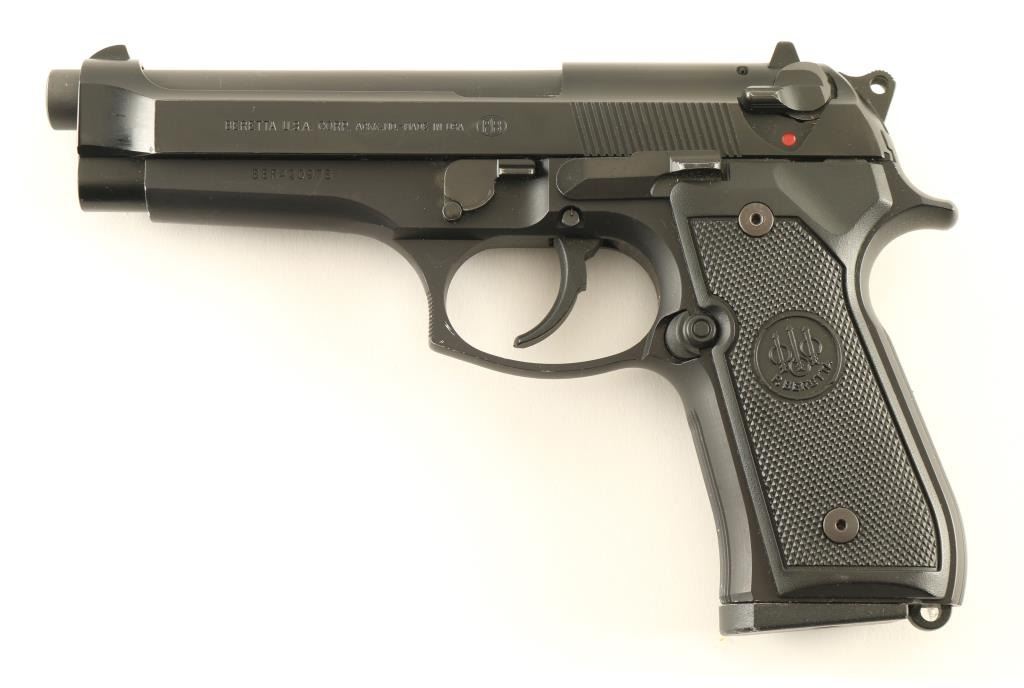 SN: BER420978, Semi Auto Pistol SA/DA 9mm with 4.9 Inch barrel, Rear sight is drift adjustable, Comes with 1 10 round magazine, Manual ambidextrous safety, Plastic grips, Metal finishes is fine with only minor holster wear, Bore is excellent, NRA excellent Modern Firearm