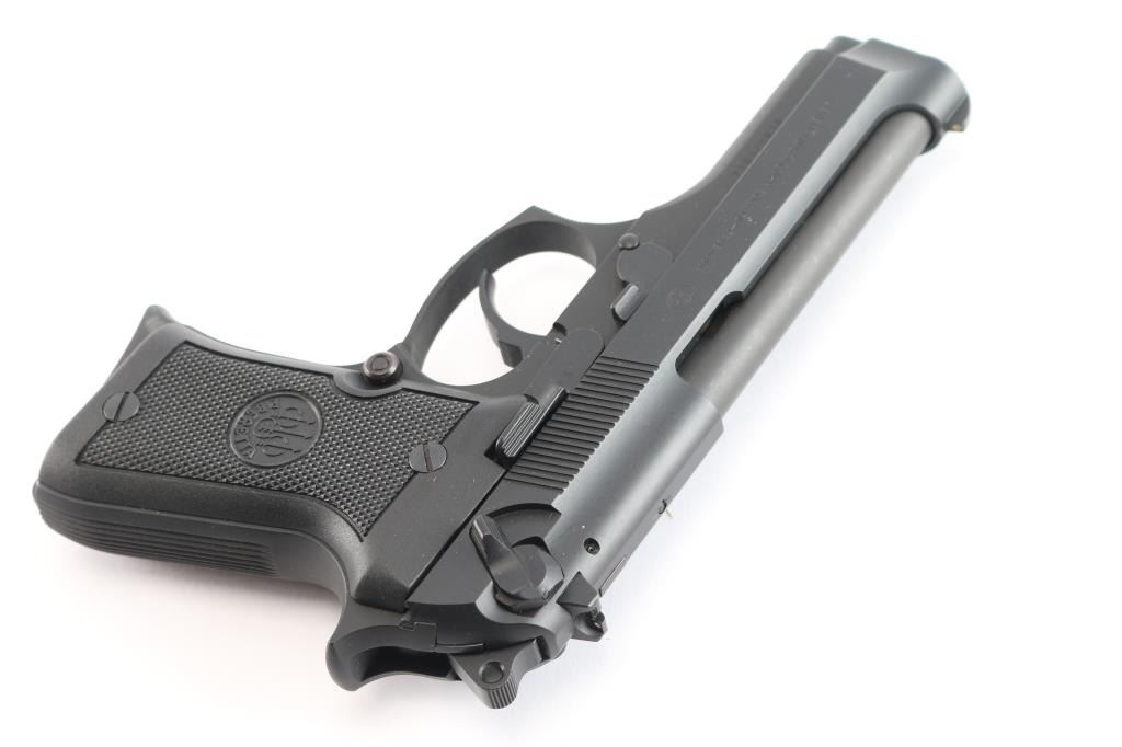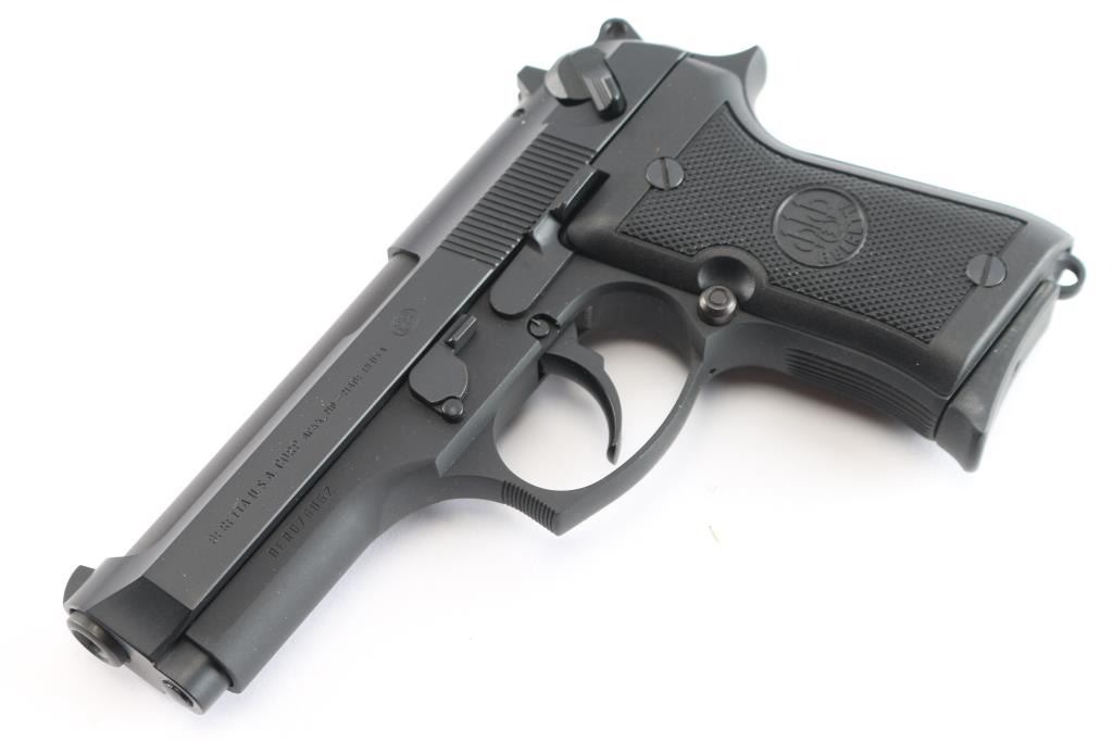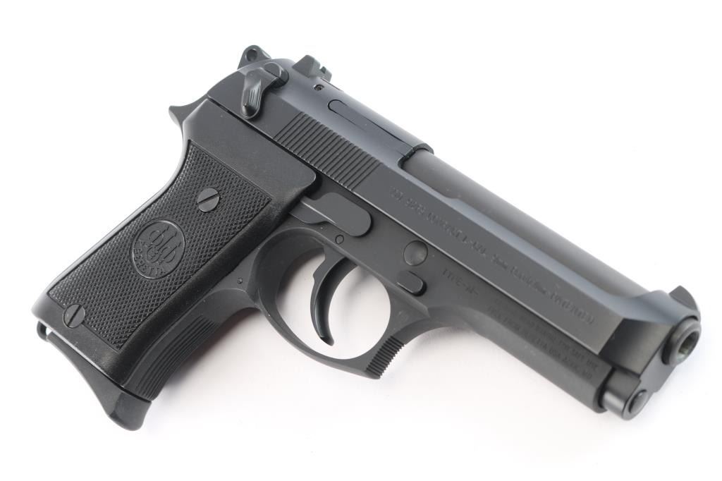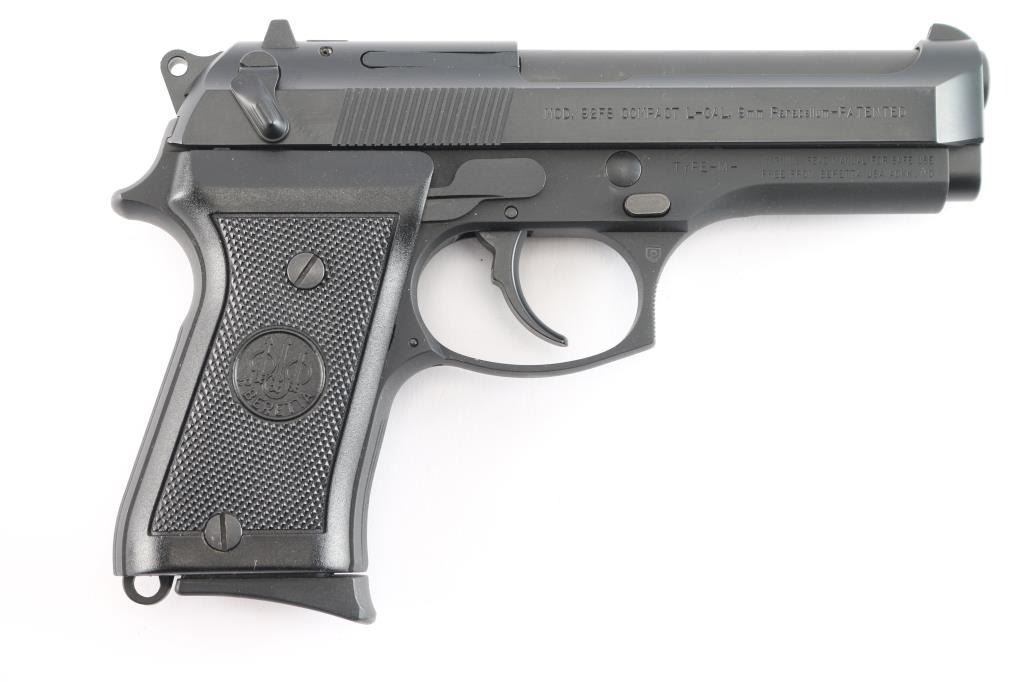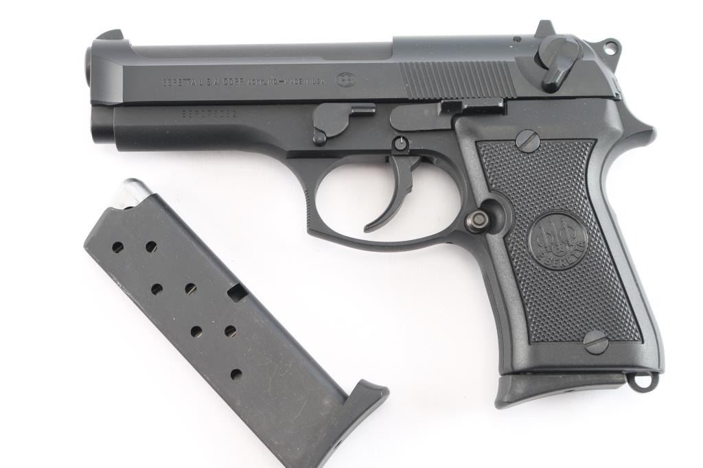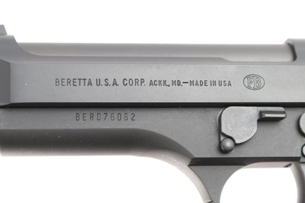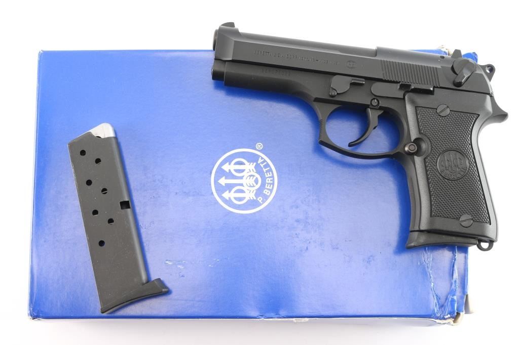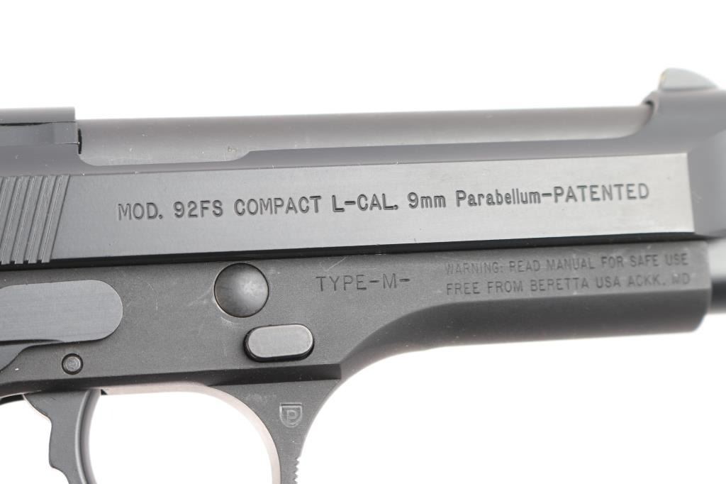 Italian made compact DA/SA semi-automatic blow-back pistol chambered for 9x19mm ammunition, manufactured circa 2003 (Date marked on box). Imported by Beretta U.S.A. from Accokeek, MD. Pistol features a matte black finish, a 4-1/4" barrel, fixed blade front sight with white dot, dovetailed notched rear sight with white dots, skeletonized hammer with serrated spur, smooth curved trigger, push button magazine release, metal guide rod, serrated trigger guard, serrated grip straps, anodized aluminum type "M" frame, single-stack eight round magazines, lanyard loop on butt, slide mounted ambidextrous safety/decocker, and checkered black plastic grips with Beretta logos. The frame has a black anodized finish, and the slide has a black Bruniton proprietary finish. The original anodized finish retained is approximately 99% with nothing remarkable. The Bruniton slide finish is in excellent condition. Metal displays no rust or deformation. Bore is bright with strong rifling, and the plastic grips are also excellent. The action is smooth and crisp. Pistol includes two single-stack eight round magazines total, original factory cardboard box with end label, original factory blue hard plastic box, manual, and Beretta lock.