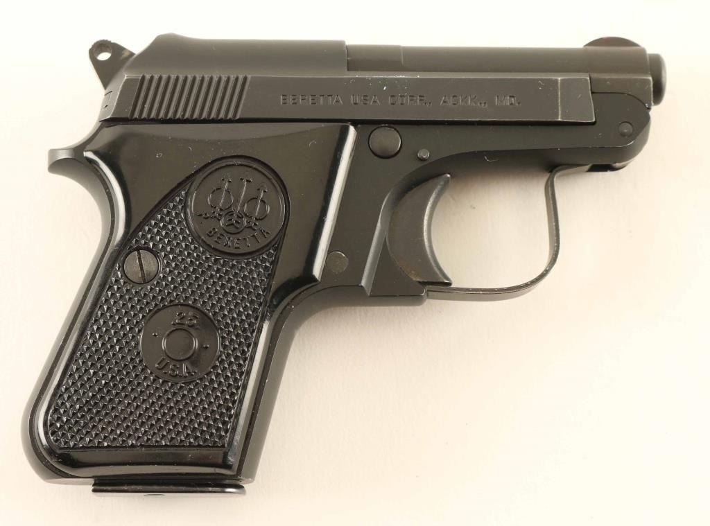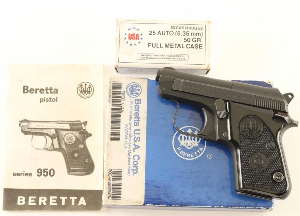 American made single action semi-automatic pocket pistol chambered in .25 Auto. Features a matte blued/black finish, 2.4" tip-up barrel, rear cocking serrations on the slide, fixed sights, smooth trigger, serrated round hammer spur, thumb safety, push button magazine release, factory 8 round magazine and two-piece checkered black plastic grips with Beretta insignias. Includes the original two-piece factory cardboard box with manual and a partial box of Olin 50 grain FMJ ammunition. Pistol exhibits approximately 95% of it's matte finish showing light edge wear and scattered handling marks/scratches. Action is strong, the bore is excellent and the plastic grips are very good with some light scratches. Condition is NRA Very Good++. ***Modern Firearm***