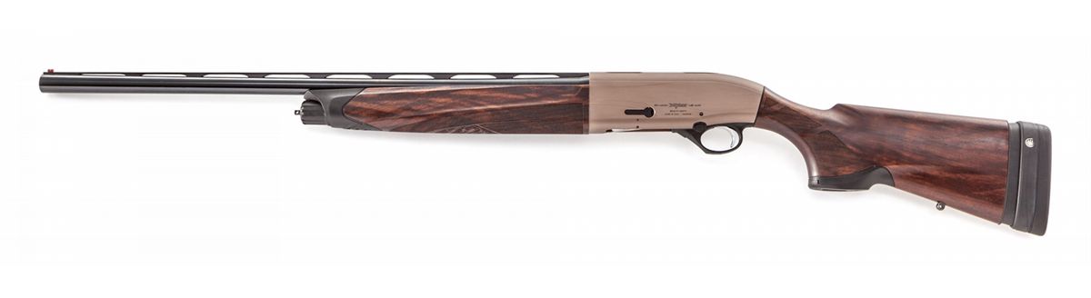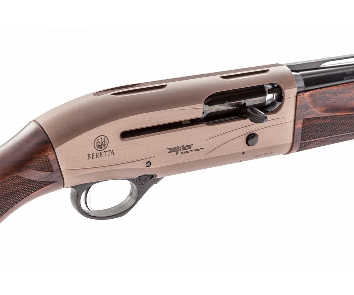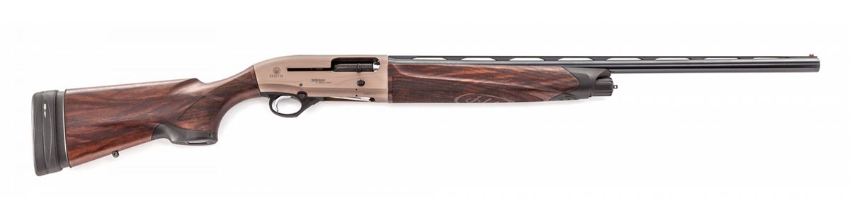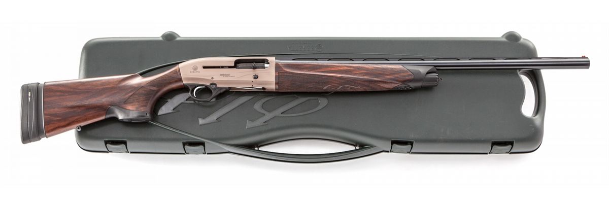 Beretta A400 Explor Semi-Automatic Shotgun, #XA057213, 12 ga., 26'' vent rib barrel with fiber-optic front bead, bronze anodized aluminum frame, factory checkered European walnut stock and forend, with factory adjustable recoil pad, extra chokes, lube, tool, and instructions, all in original Beretta hard case. Also featured is the gun pod multi-functional electronic device housed in the pistol grip cap, which will count the total number of shots fired, shots at different shooting sessions, outdoor temperature in C and F degrees, and also provides an indication of the energy of the ammunition fired. Condition is excellent, appearing new and unfired. Est.: $1,400-$1,600. (Modern) (Consecutive to the below lot.)