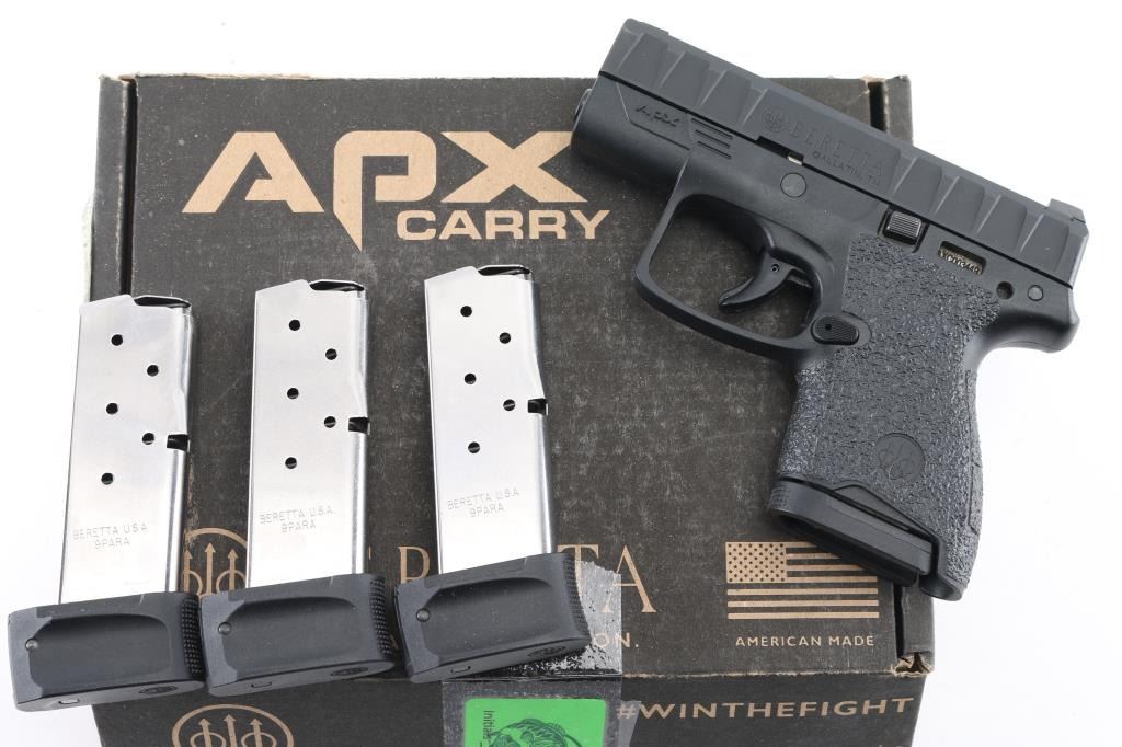 Modular striker fired semi-automatic compact pistol chambered in 9x19mm, manufactured in Italy. Features a black Nitron finished slide with full-length cocking serrations, 3” barrel, dovetailed white dot sights with square notch rear sight, polymer trigger with integrated safety, decocking button on the right side of the frame, reversible push button magazine release, 6 round factory magazine, textured front strap & interchangeable backstraps. Includes the original factory box with literature, 3 spare magazines with finger extensions. Beretta soft case. Pistol retains approximately 99% of its original finish showing very little wear. Action is smooth, the bore is pristine and the polymer is fine. Condition is NRA Excellent. Modern Firearm.