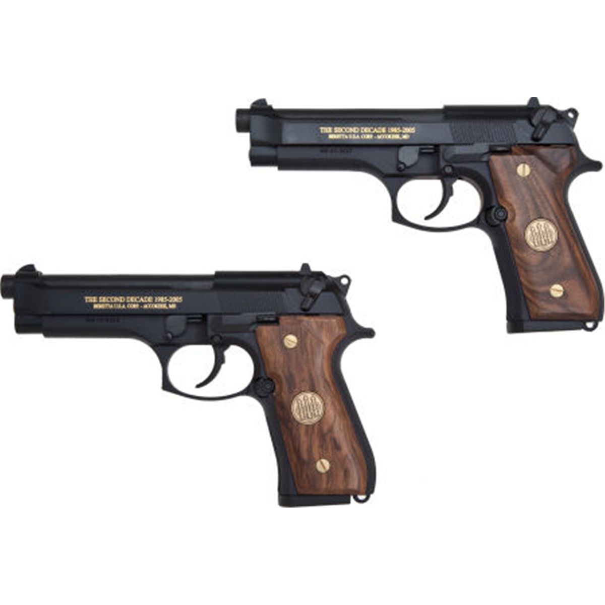 Beretta Lot (2)-M9 Limited Edition 9mm Semi-Automatic Pistol With Display Case. Consecutive Serial no. M9-05-0046 & M9-05-0047 , 9mm, 4.9"" barrel, matt black finish, wood grip panels with subdued gold emblem and screws, gold inlaid slide lettering: ""The Second Decade 1985-2005"" on left & ""America's Defender"" on right, ambidextrous safety (de-cocking lever), dot-post fixed sights, comes with two-15 shot magazines, solid oak display case with glass view lid and manual in factory plastic case & double factory cardboard box. 2 Each, M9 w/display case MSR approx. $799. Condition: As-New in factory boxes. Bores are bright, actions strong. NRA FIREARMS FOR FREEDOM PROGRAM